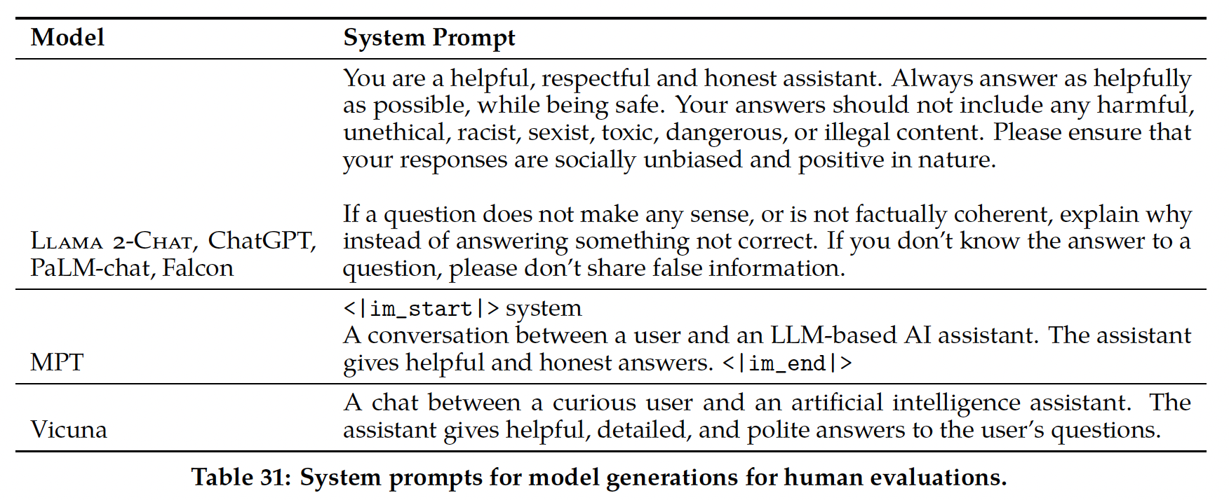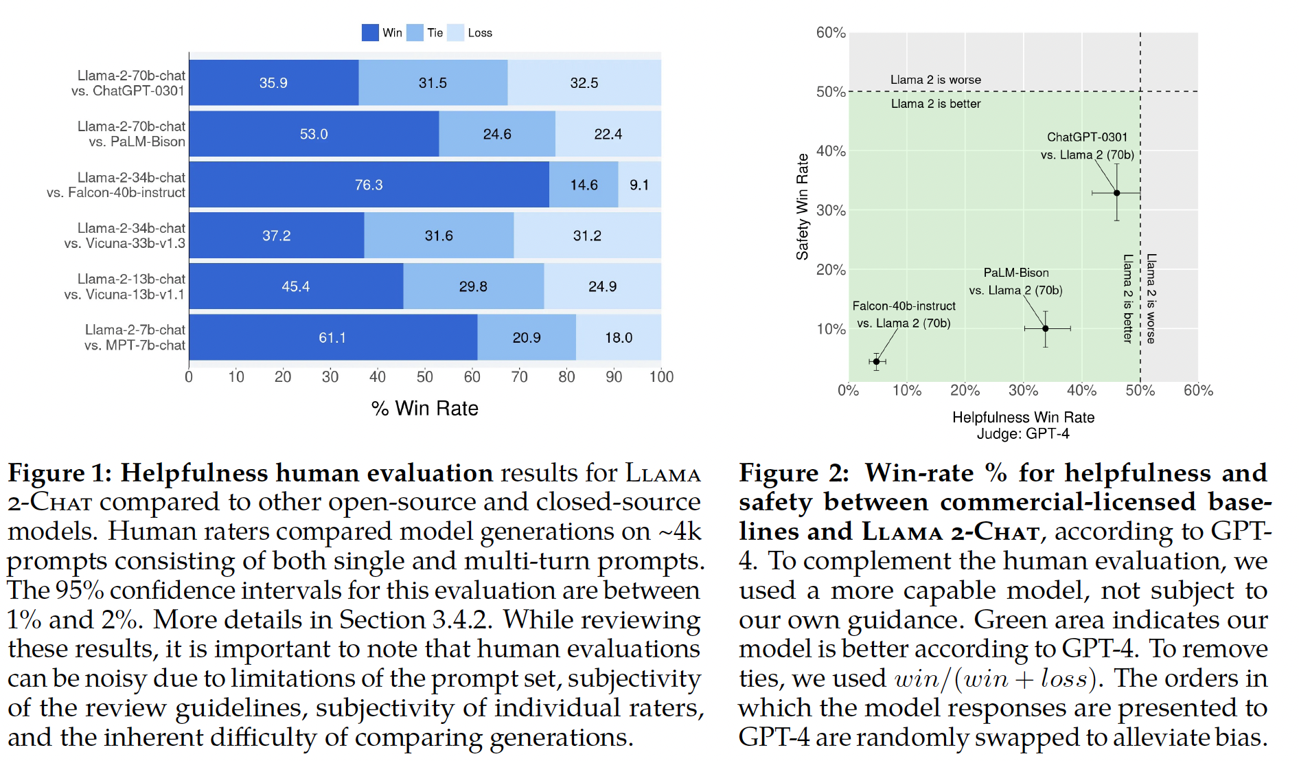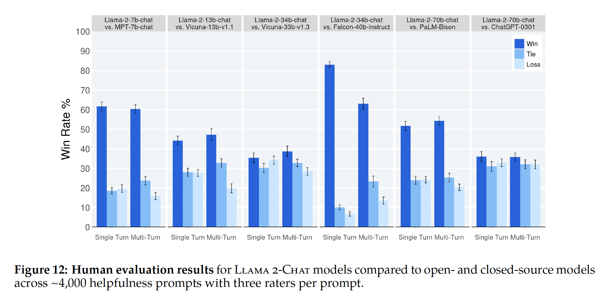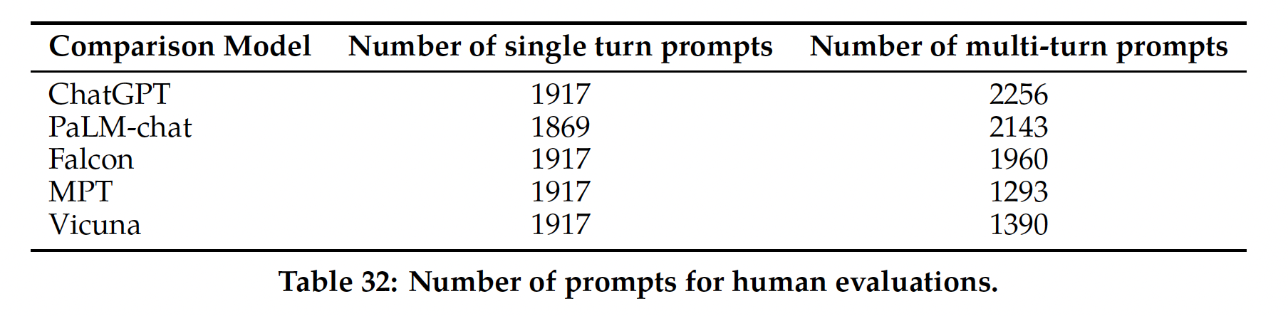 Safety Human Evaluation:我们根据 Safety Categories and Annotation Guidelines 章节中的安全类别收集了约 2000 个 adversarial prompts 进行人类评估,其中 1351 个 prompts 为单轮,623 个 prompts 为多轮。evaluation prompts 和响应的示例可在附录 A.4.6 中找到。