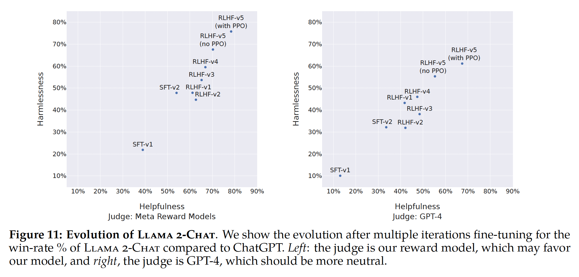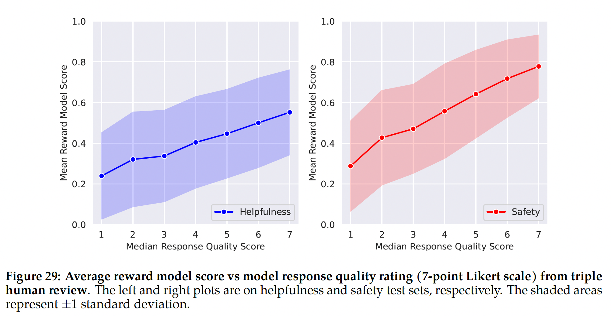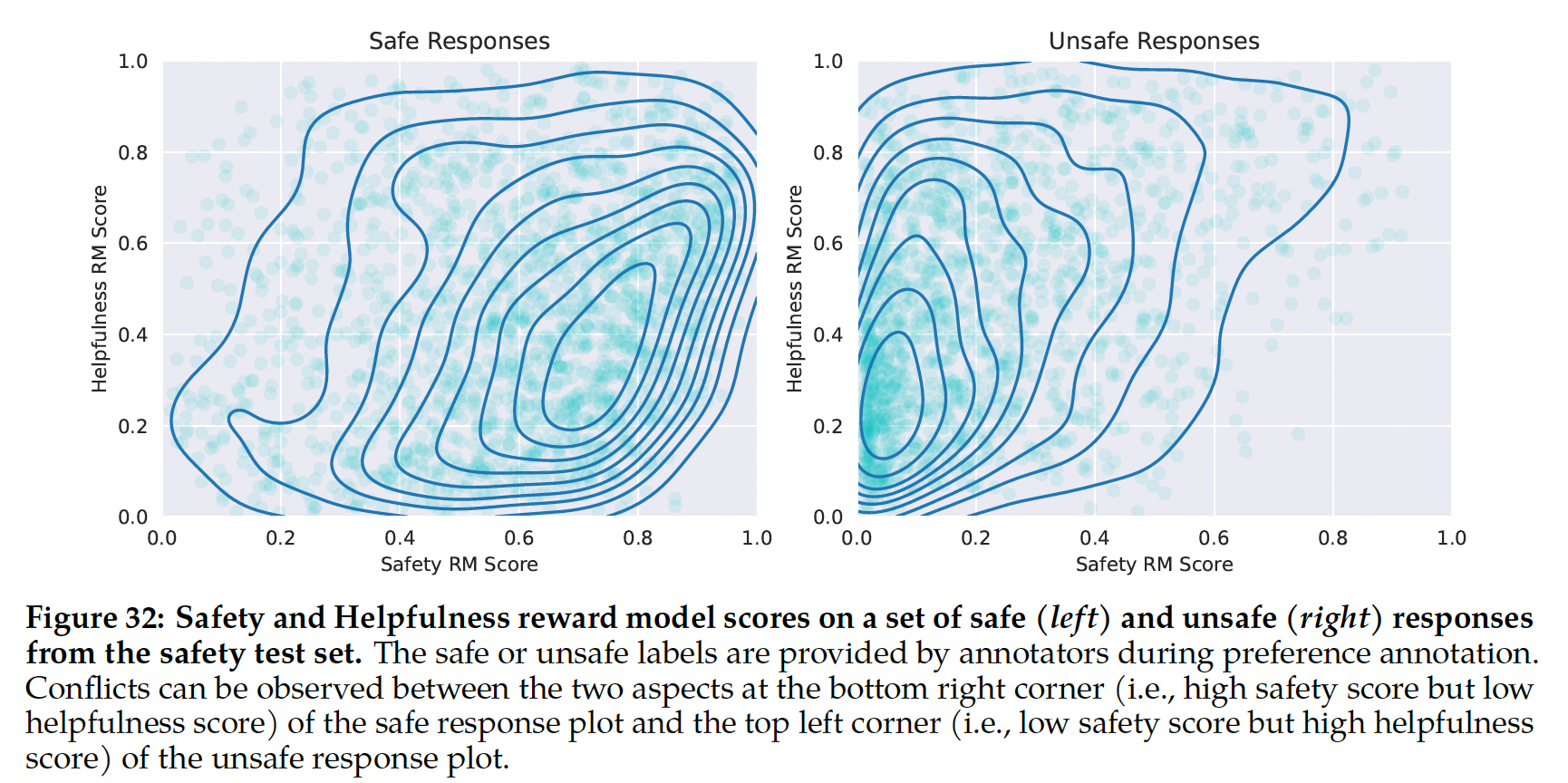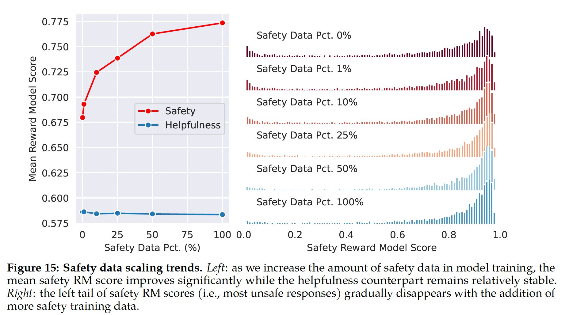 在右图,我们没有在的 helpfulness score 分布在 safety tuning with RLHF 之后得以保留。换句话说,给定足够的 helpfulness 训练数据,额外的 safety mitigation 阶段不会对有用性造成任何明显的负面影响。