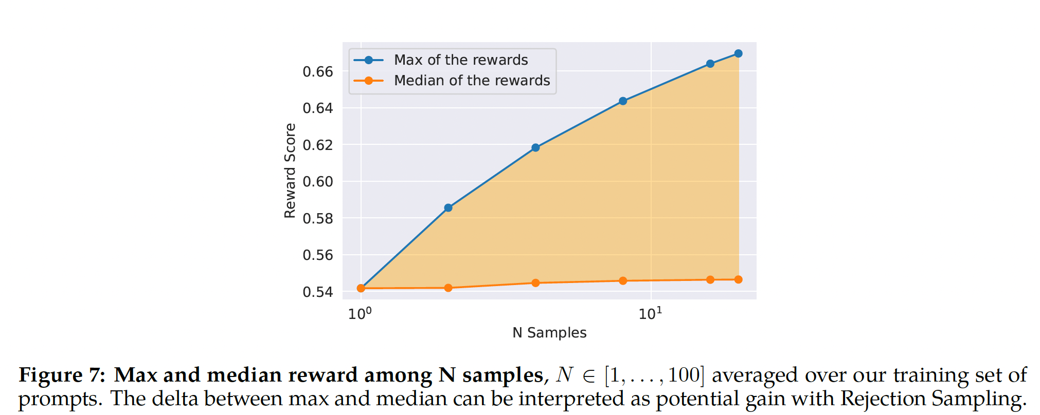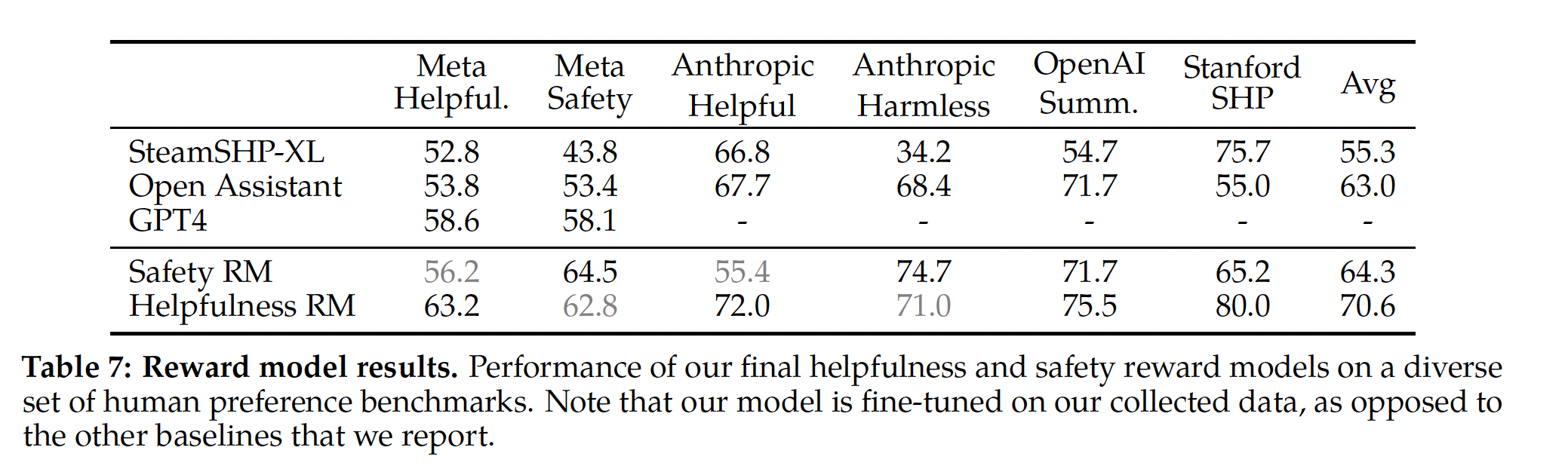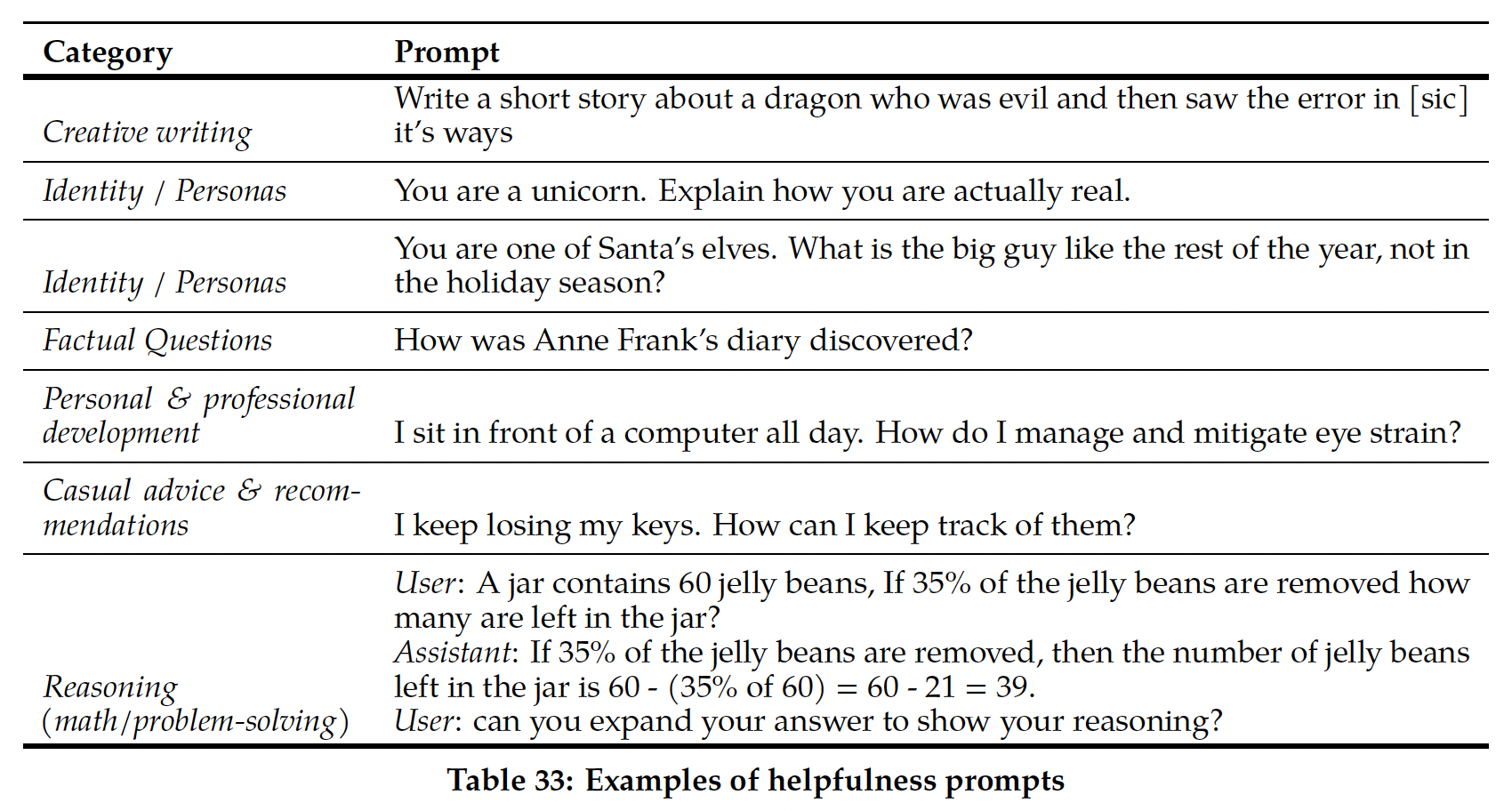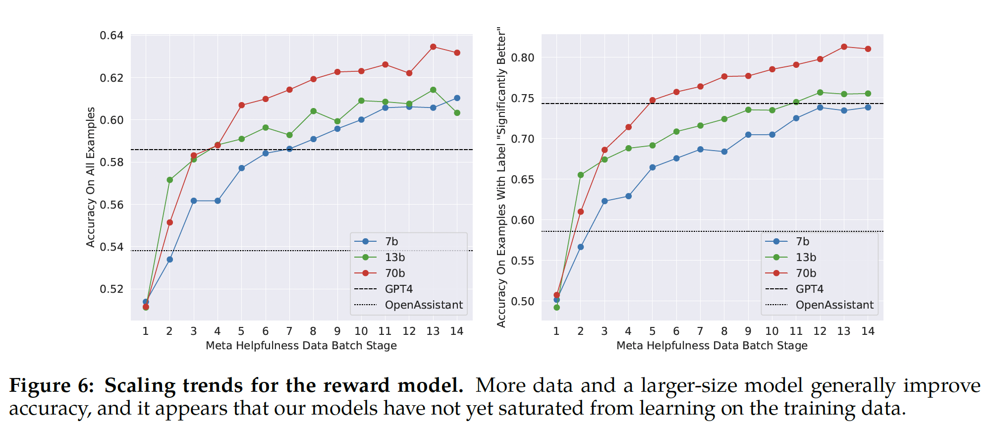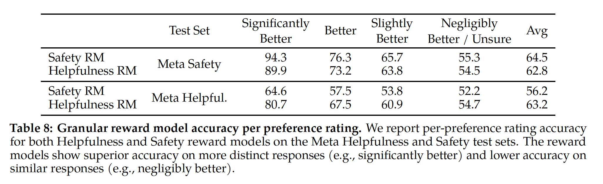 在右图,我们没有在的 helpfulness score 分布在 safety tuning with RLHF 之后得以保留。换句话说,给定足够的 helpfulness 训练数据,额外的 safety mitigation 阶段不会对有用性造成任何明显的负面影响。