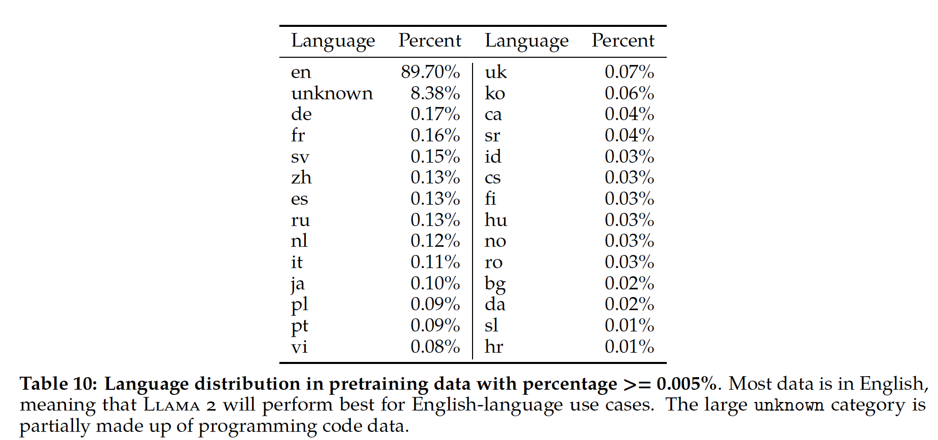 此外,我们的 Llama 2-Chat 初始版本主要集中在英语数据上。虽然我们的实验观察结果表明,模型在其他语言上获得了一定的专业性,但其专业性有限,主要是由于可用的 non-English 预训练数据有限(如 Table 10 所记录的)。因此,模型在英语以外的语言上的性能仍然脆弱,应谨慎使用。