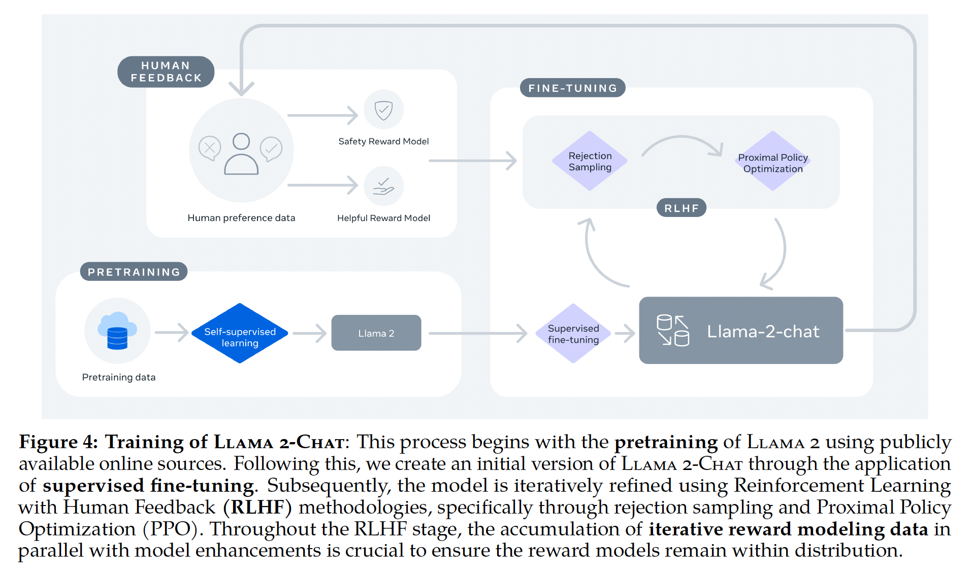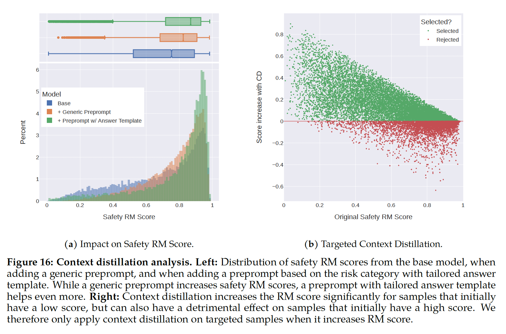 Safety Context Distillation :最后,我们使用 context distillation (《A general language assistant as a laboratory for alignment》)来改进我们的 RLHF 流程。这涉及通过在 prompt 之前加上一个 safety preprompt(例如,"You are a safe and responsible assistant")来生成更安全的模型响应,然后在没有 safety preprompt 的情况下对模型进行微调,从而本质上将 safety preprompt (context) 蒸馏到模型中。我们使用一种 targeted approach ,允许我们的 safety reward model 为每个样本选择是否使用 context distillation 。