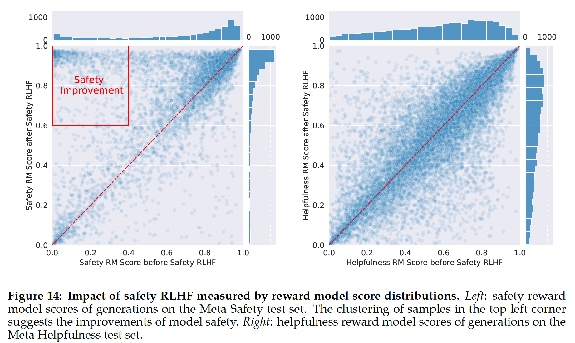 在左图,我们观察到 safety tuning with RLHF 后,safety set 上 safety RM scores 的分布向更高的奖励分数移动,靠近零分的长尾变薄。左上角出现了一个明显的聚类,表明 model safety 的改进。
