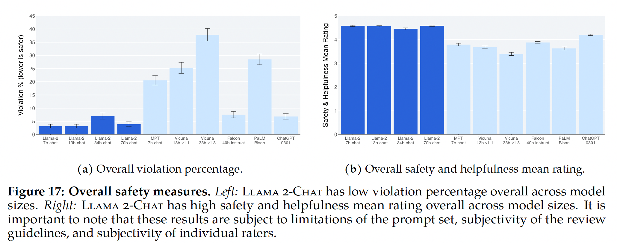 我们在 Figure 17 中显示了各种 LLM 的整体违规百分比和安全评分。在所有模型规模中,Llama 2-Chat 具有可比的或更低的整体违规百分比,而 ChatGPT 和 Falcon 其次,然后是MPT 和 Vicuna 。重要的是要谨慎解释这些结果,因为它们会受到 prompt set 局限性、review 指南的主观性、内容标准、以及个人评分者主观性的影响。 通过手动分析,我们发现 Falcon 的响应通常很短(一两句话),因此不太容易产生不安全内容,但通常也不太有帮助。 这反映在 Falcon 大量的评分为 3 分的响应。因此,我们注意到,尽管 Falcon 和 Llama 2-Chat(34B) 的违规百分比看起来相似(3.88 vs 4.45 ),但 Figure 17b 中 Falcon 的平均评分远低于 Llama 2-Chat 。