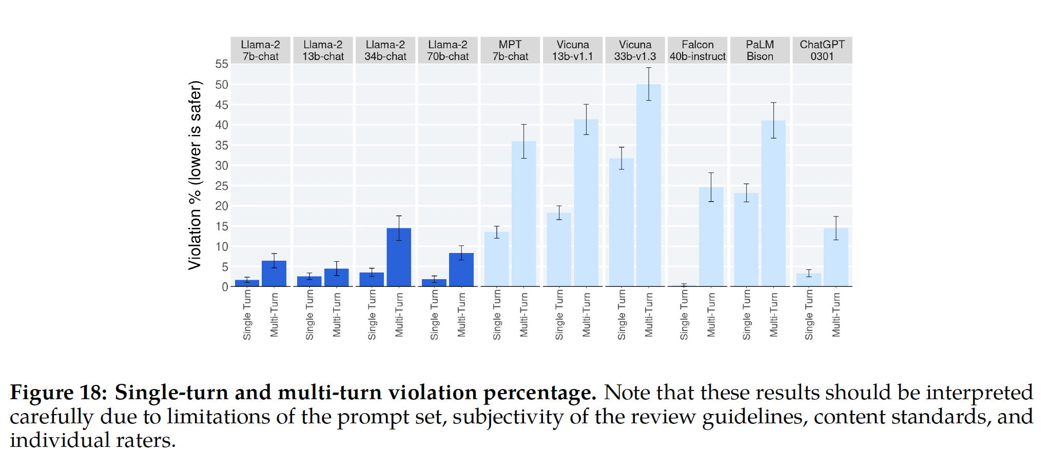 在 Figure 18 中,我们分别报告了单轮对话和多轮对话中的违规百分比。各模型的一个趋势是:多轮对话更容易诱导不安全的响应。也就是说,与 baseline 相比,Llama 2-Chat 的表现仍很好,特别是在多轮对话中。我们还观察到,Falcon 在单轮对话中表现特别出色(很大程度上是由于其简洁性),但在多轮对话中表现要差得多,这可能是由于缺乏 multi-turn supervised fine-tuning data。