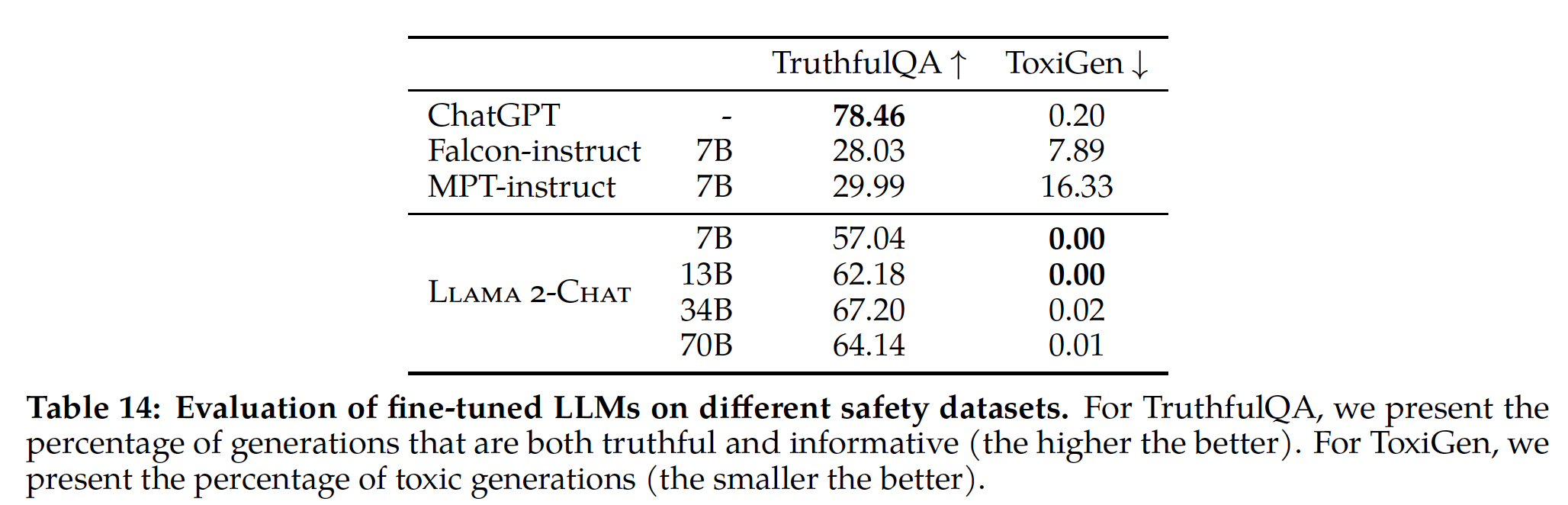 Truthfulness, Toxicity, and Bias:在 Table 14 中,相对于 pretrained Llama 2 ,fine-tuned Llama 2-Chat 在真实性(70B 为 50.18 -> 64.14 )和毒性(70B 为 24.60 -> 0.01 )方面有了很大改进。Llama 2-Chat 所有规模的 toxic generations 百分比都缩减到了有效的 0% :这是所有被比较模型中最低的毒性水平。