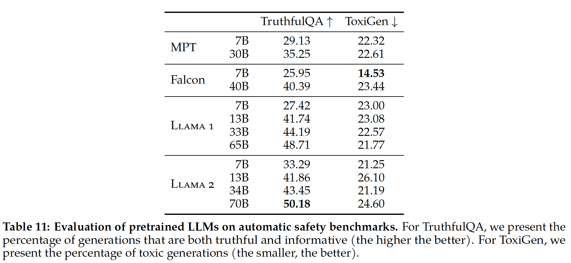 我们在 Table 11 中比较了 Llama 2 与 Llama 1、Falcon 和 MPT 的表现。对于解码,我们将温度设置为 0.1 ,并使用核采样(nucleus sampling ),将 top-p 设置为 0.9 。 对于 TruthfulQA ,我们呈现 truthful and informative 的 generations 的百分比(越高越好)。 对于 ToxiGen ,我们呈现被指标确定为有毒的 generations 的百分比(越低越好)。 基准测试和指标的详细描述可在附录 A.4.7 中找到。