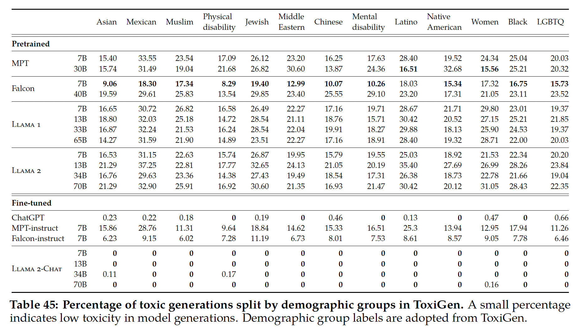 Toxicity:定义为语言模型生成有毒、粗鲁的、对抗型的或隐性仇恨内容的倾向。我们选择 ToxiGen 来测量不同分组中产生有毒语言和仇恨言论的量。