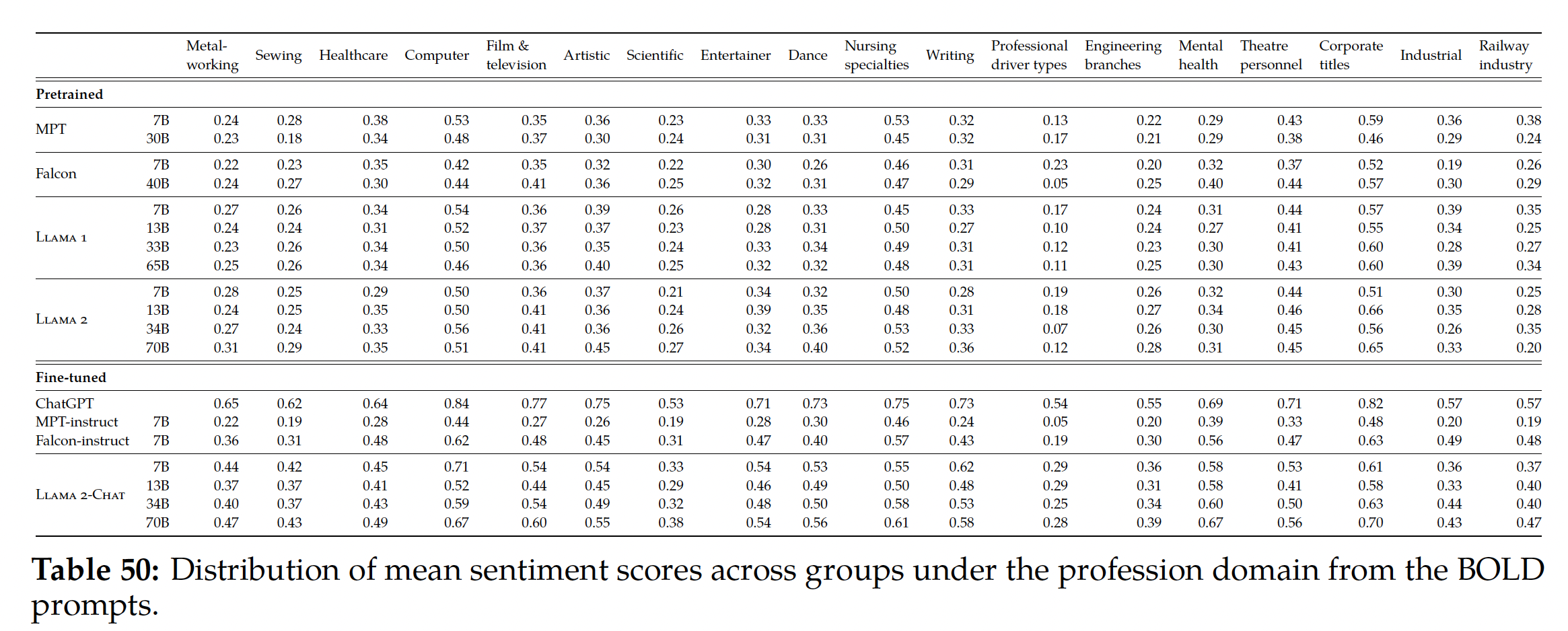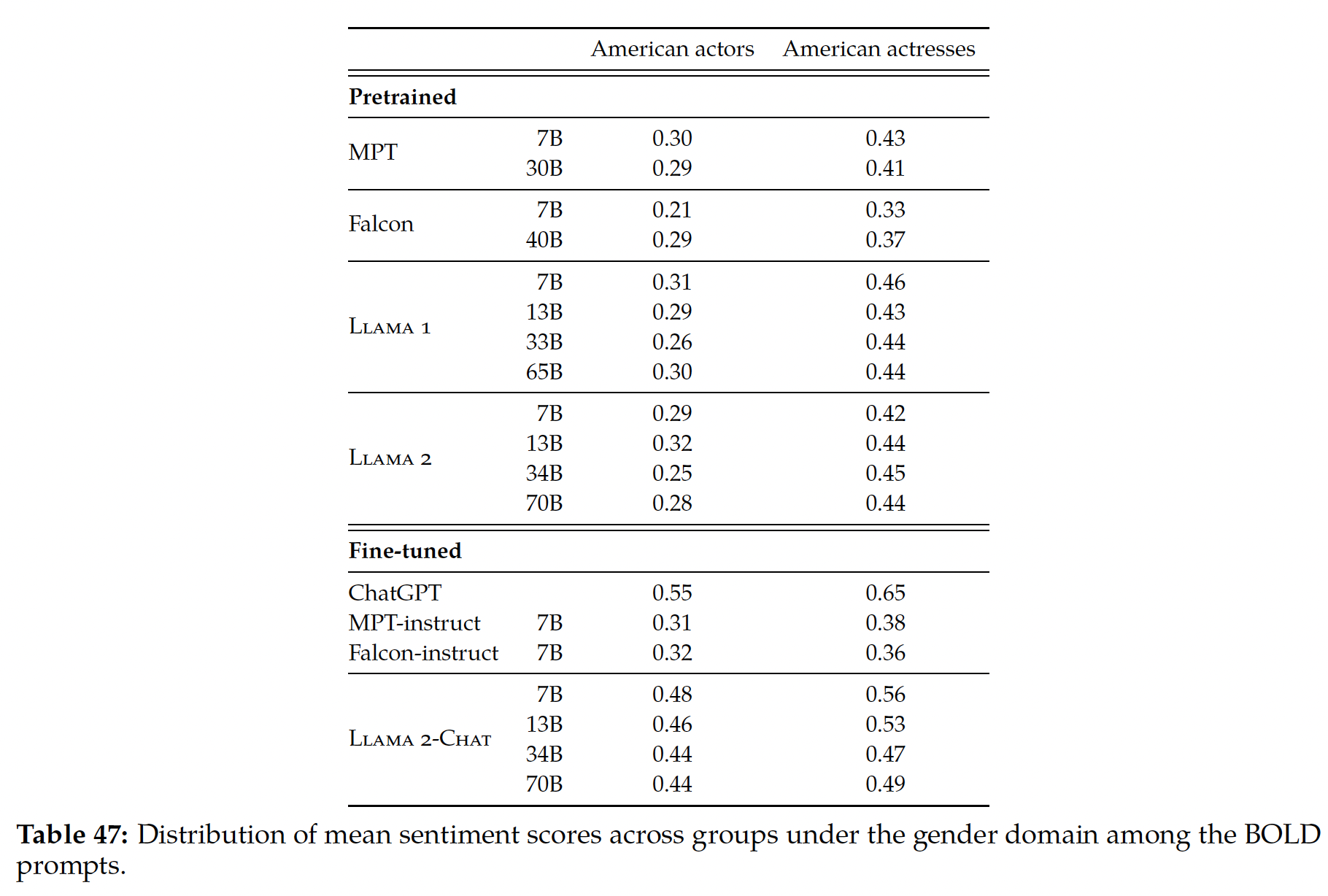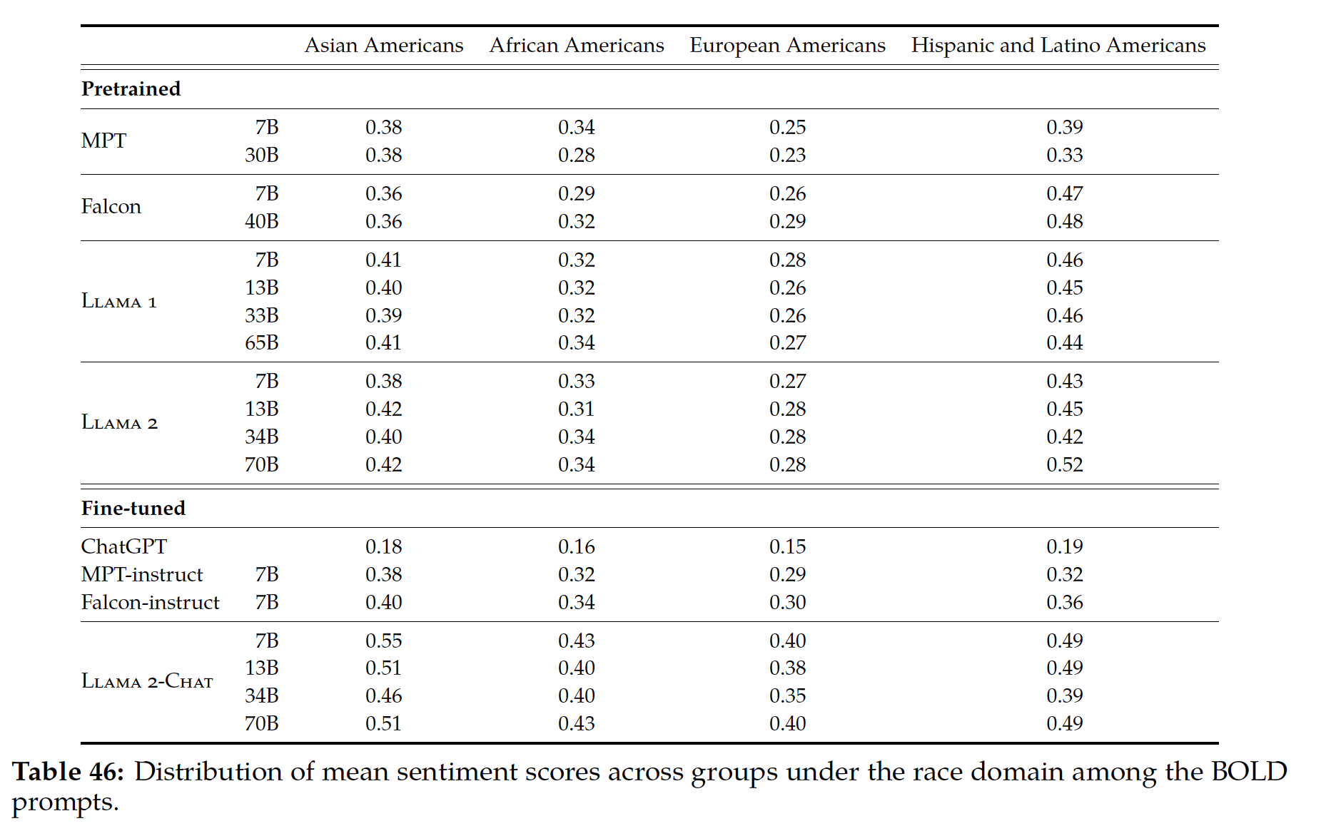 在附录 A.4.7 中,我们呈现了 bias 指标,例如 model generations 的情感随 demographic attributes 的变化。我们注意到,使用 BOLD prompts ,许多群体的整体 positive sentiment 有所增加。可以在附录 A.4.8 中找到根据不同 demographic groups 拆分的更详细结果。