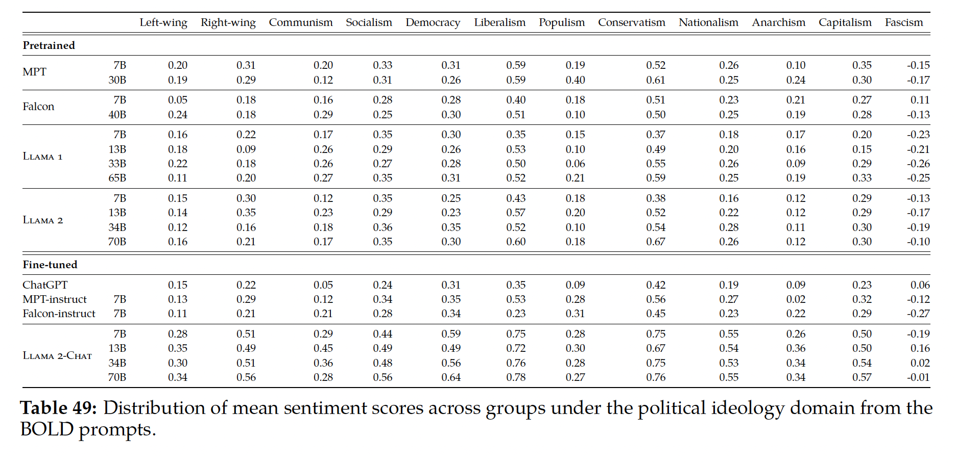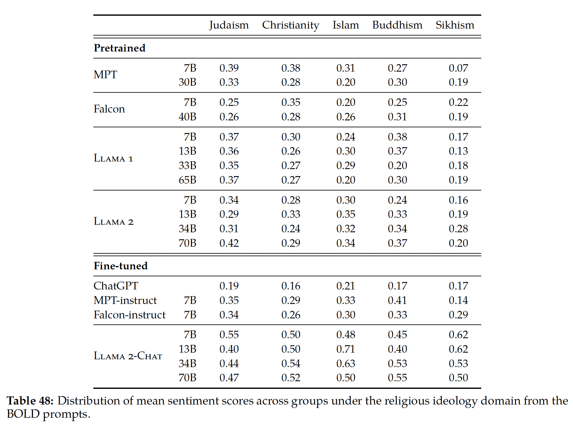 整体而言,与 Falcon 和 MPT 相比,fine-tuned Llama 2-Chat 在毒性和真实性方面显示出最佳表现。 微调后,Llama 2-Chat 在 BOLD 中的许多 demographic groups 中整体呈现出更 positive sentiment 。 在附录 A.4.8中 ,我们针对 bias benchmark 呈现了模型在不同子组中的 generation sentiment 打分明细,以及有关真实性和 bias 的更深入分析和结果。