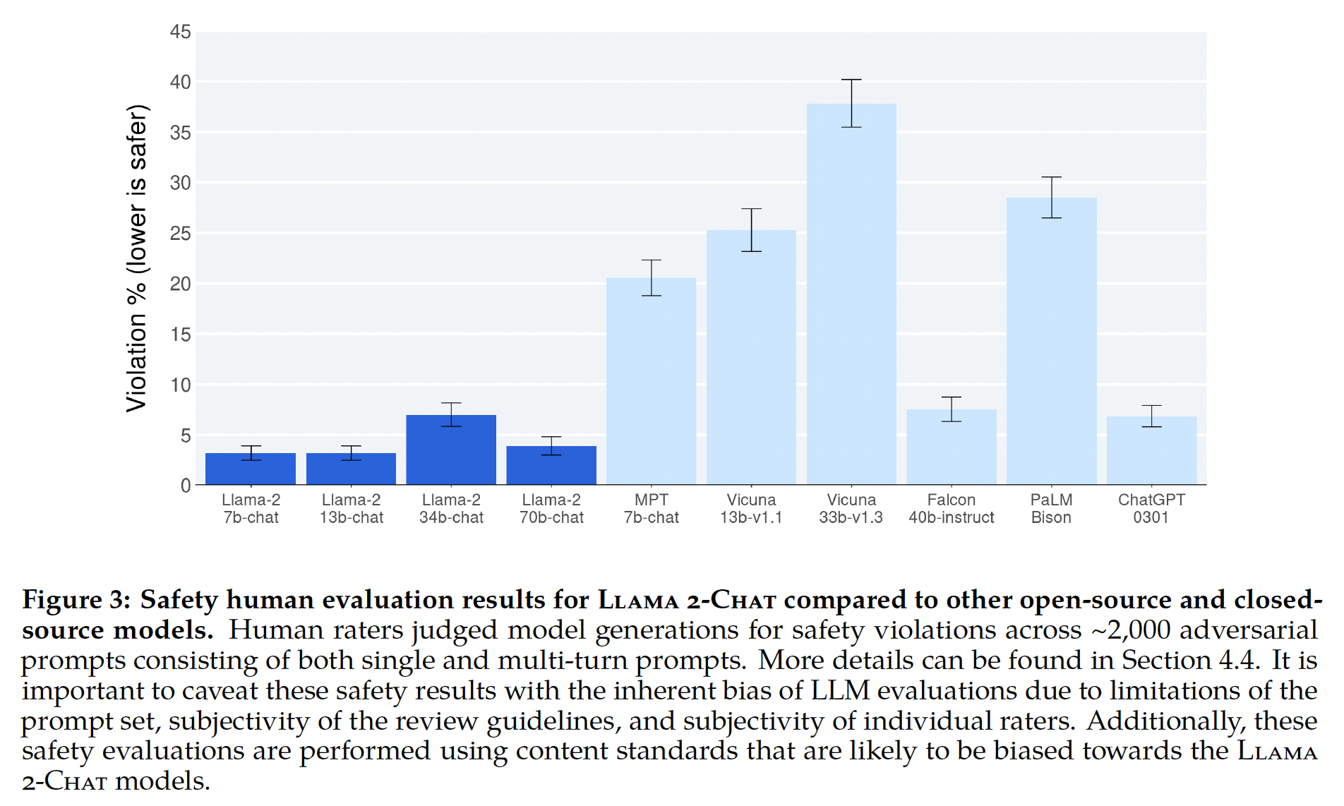我们认为 1 分或 2 分的评级属于违规,并使用违规百分比作为主要评估指标,以平均评分为补充。每个样本由三名标注员进行标注,我们采用多数表决来确定响应是否违规。我们使用 Gwet’s AC1/2 统计量测量 inter-rater reliability: IRR,与 helpfulness human evaluation 相同。IRR 分数根据 annotation batch 的不同在 0.70 至 0.95 之间,这表示标注员对安全评估具有高度一致。 在 Llama 2-Chat 标注中,根据 Gwet 的 AC2 measure ,平均 IRR 为 0.92 。 我们在模型违规率较高的 batches 中看到较低的 IRR 分数,如 Vicuda ;并且在模型违规率相对较低的 batches 中看到较高的IRR 分数,如 Llama 2-Chat, Falcon, ChatGPT 。