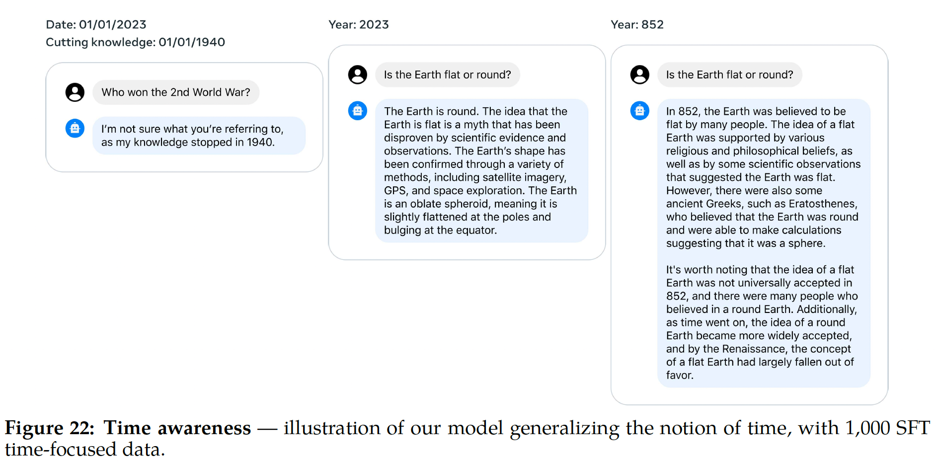 Llama 2-Chat Temporal Perception:我们的模型展示了令人印象深刻的泛化能力,如 Figure 22 所示。我们手动测试了数十个示例,并始终观察到,即使提供的信息很少,我们的模型也表现出强大的能力来以时间方式(temporal manner )组织其知识。为了向 Llama 2-Chat 灌输时间的概念,我们收集了一组与特定日期相关的 1000 个 SFT 样本。这些样本包括 "How long ago did Barack Obama become president?" 这样的问题。每个样本都与两个关键性的元数据相关联:提出 query 的日期(这会影响响应结果)、事件日期(在这个时间点之前,问题没有任何意义,即事件未发生)。