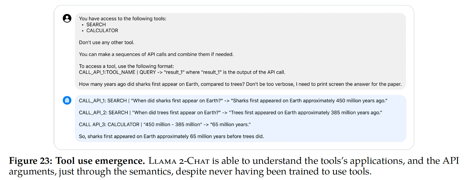 Tool Use Emergence:将 LLM 与工具集成是一个不断发展的研究领域,正如(《Augmented language models: a survey》)所强调的。 Toolformer (《Toolformer: Language models can teach themselves to use tools》)中设计的方法需要采样数百万条轨迹,并为每个工具制定 few-shot examples 。尽管如此,这种技术只对每个示例使用一个工具,并且不会扩展到一系列工具的使用。