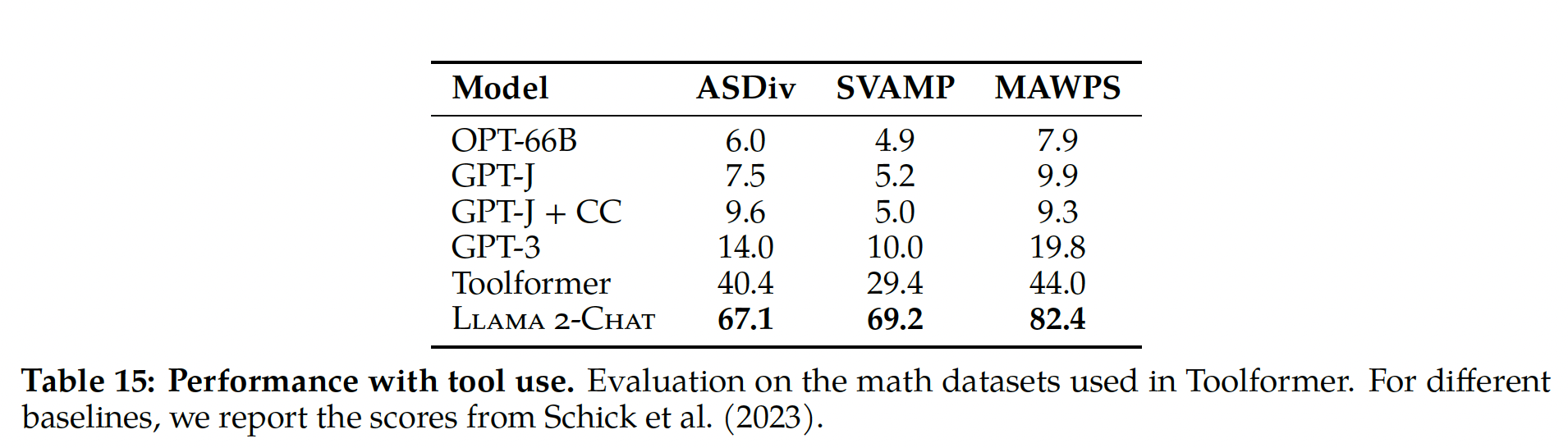 此外,我们的研究还扩展到评估具有计算器访问权限的 Llama 2-Chat 。此特定实验的结果载于 Table 15 。 尽管令人激动,LLM tool use 也可能引起一些安全问题。我们鼓励社区在这方面进行更多研究和 red teaming 。