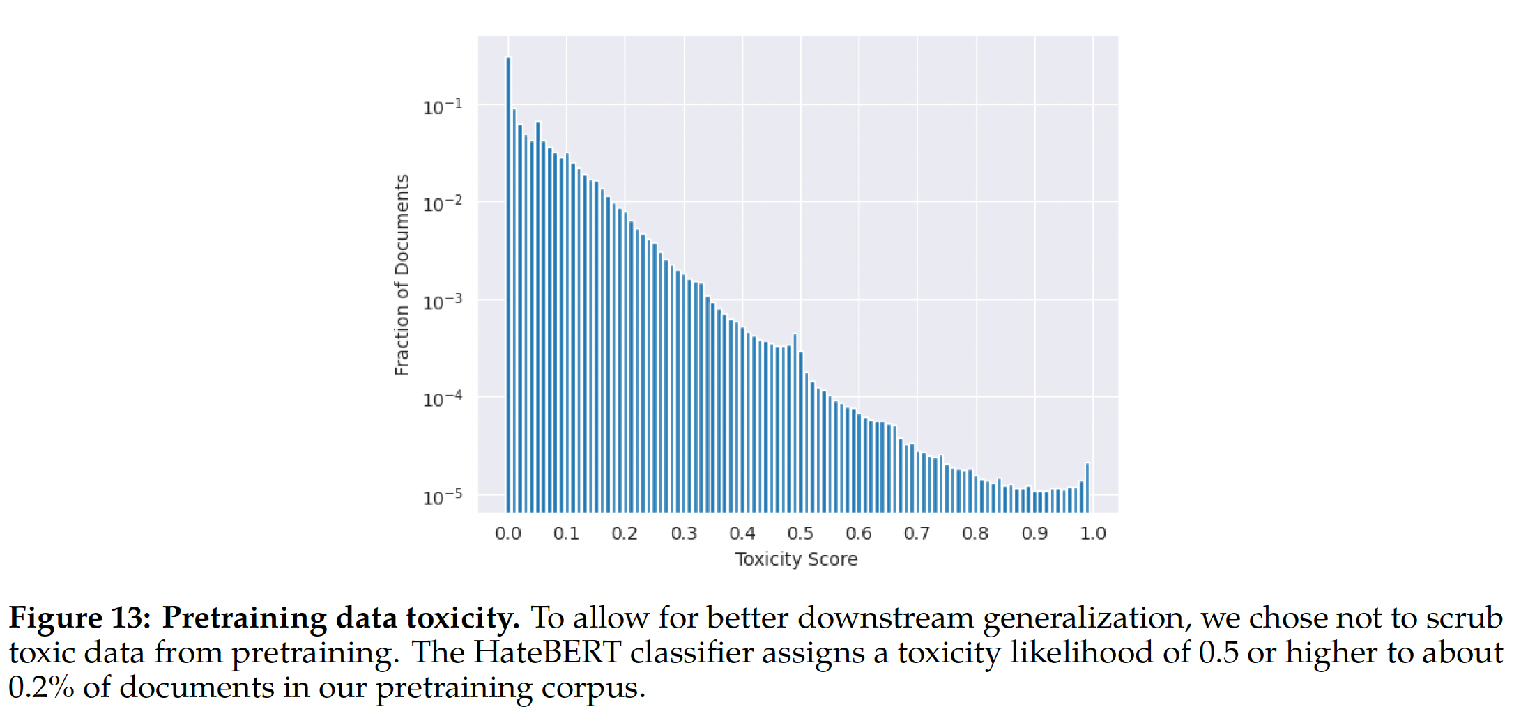 Data Toxicity:我们使用在 ToxiGen 数据集上微调的 HateBERT 分类器,用于测量预训练语料英语部分中的毒性。我们独立地对文档的每一行进行评分,并对其取平均以得到文档分数。Figure 13 显示了完整语料的 10% 随机采样中分数的分布。只有大约 0.2% 的被评估文档被赋予 0.5 或更高的可能性分数,这意味着我们的预训练数据中存在少量毒性。