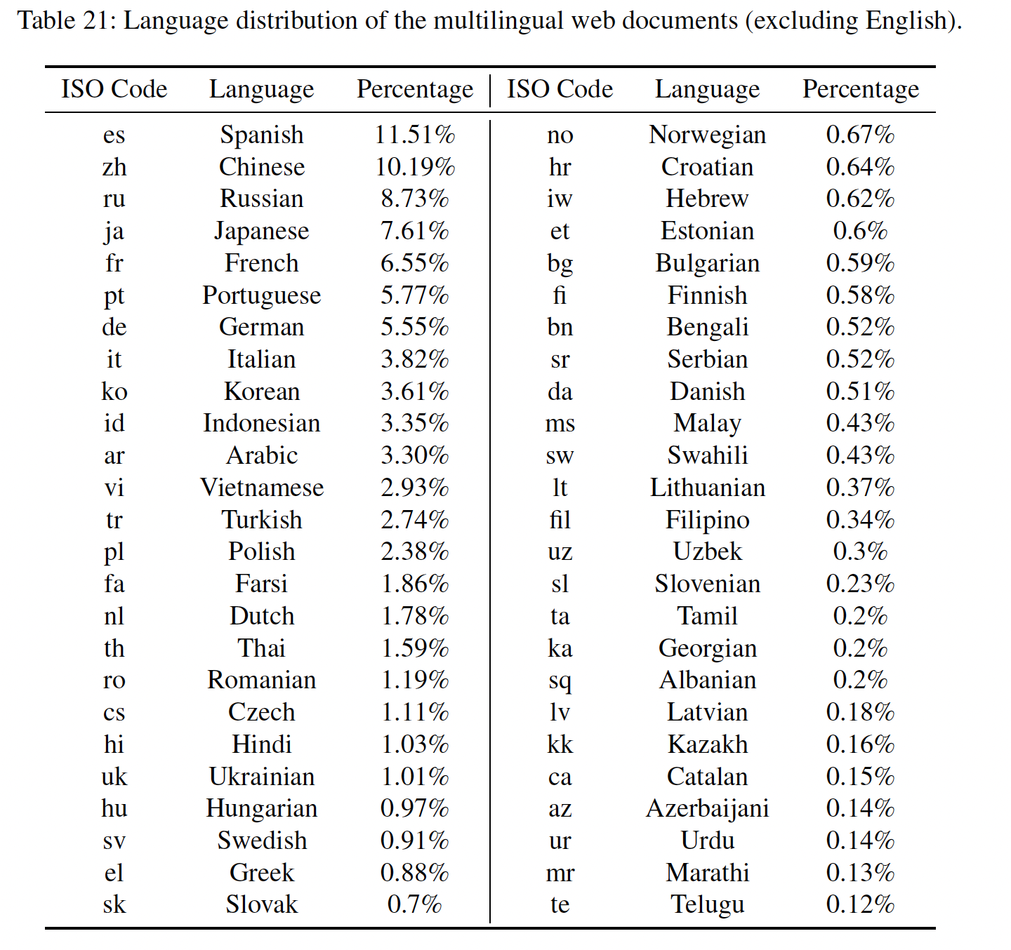 Language Identification:虽然我们的预训练数据主要是英语,但也包含少量其他语言的文本。Table 10 显示了我们语料中语言的分布,其中表格中仅包含大于文档占比 0.005% 的语言。我们的分析使用了 fastText 语言识别工具,语言检测阈值设置为 0.5 。英语占主要地位的训练语料意味着该模型可能不适合用于其他语言。