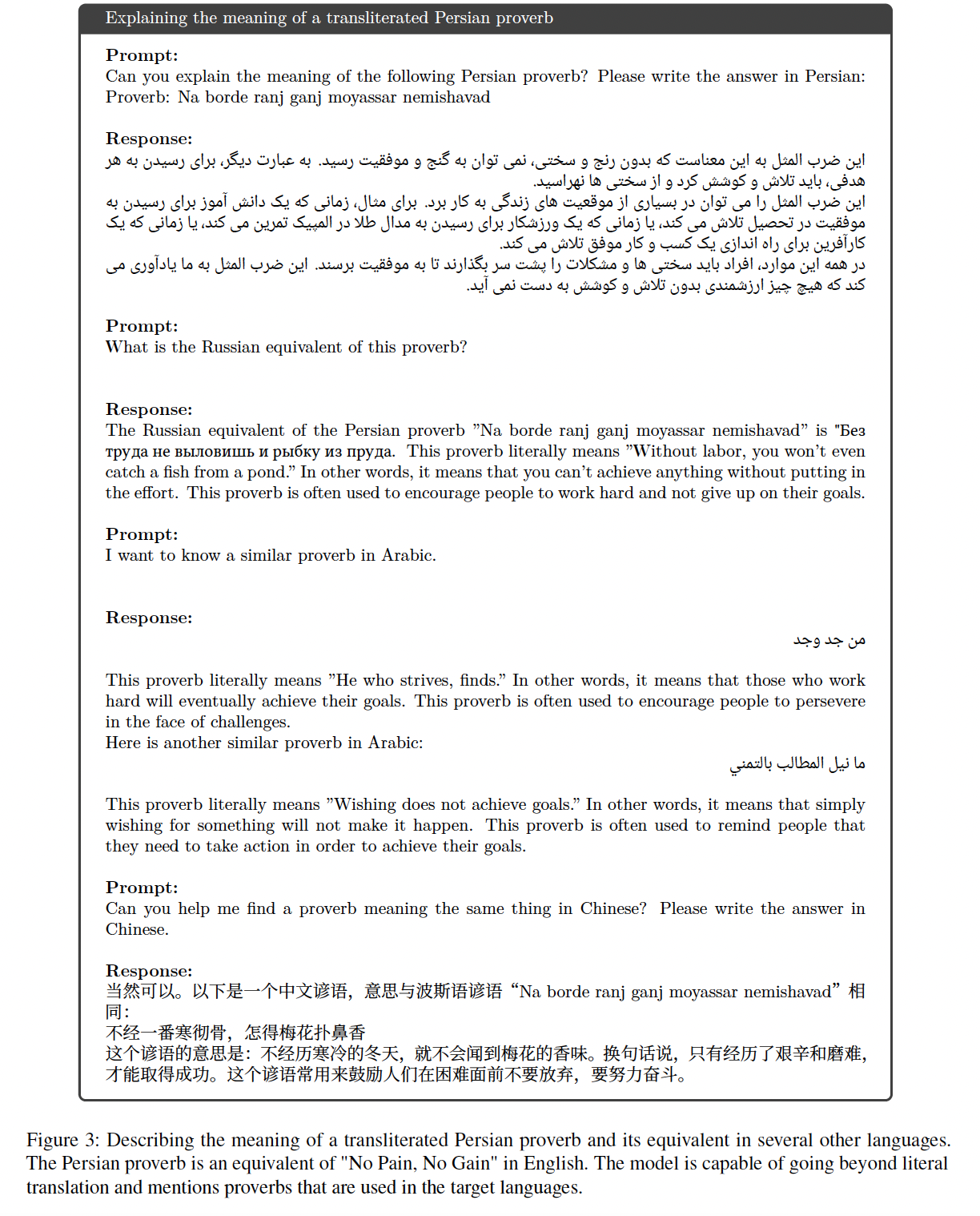 多语言理解:以前关于大型语言模型的工作在多语言领域进行了有限的评估。在这项工作中,作者对包括机器翻译、摘要、问答在内的各种语言的多语言基准进行了更彻底的评估。