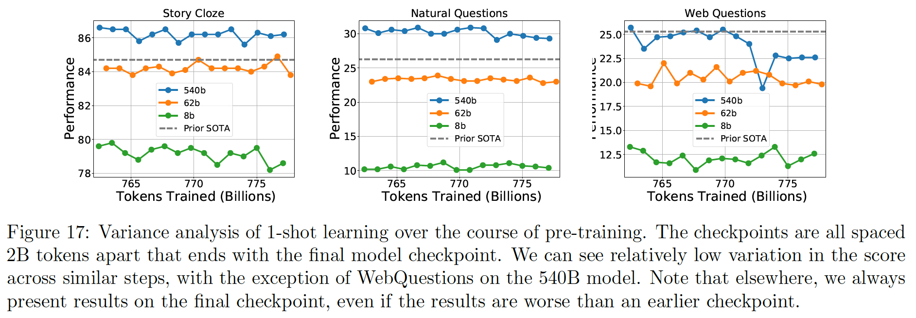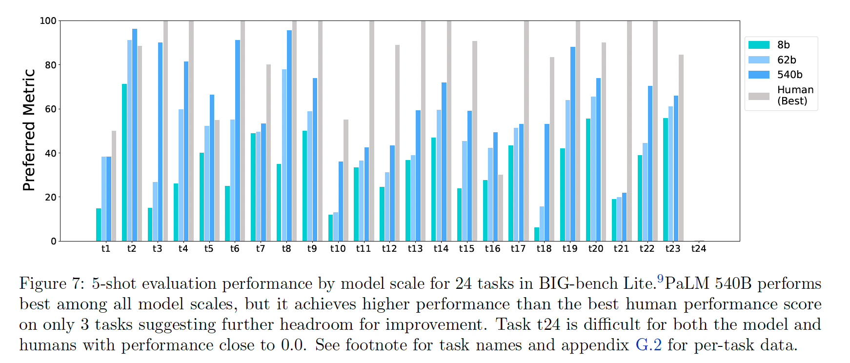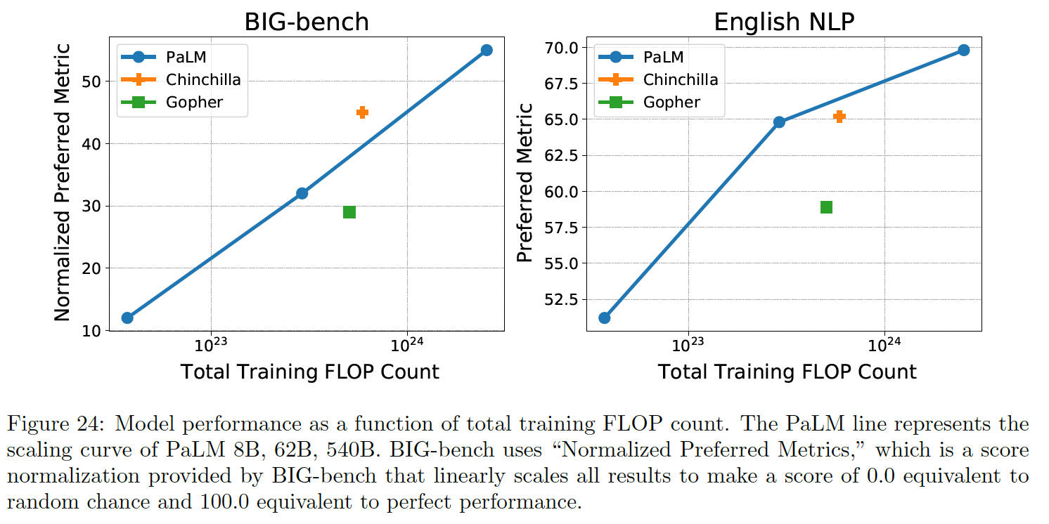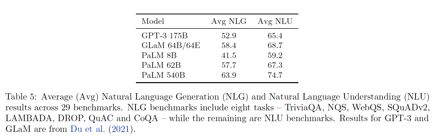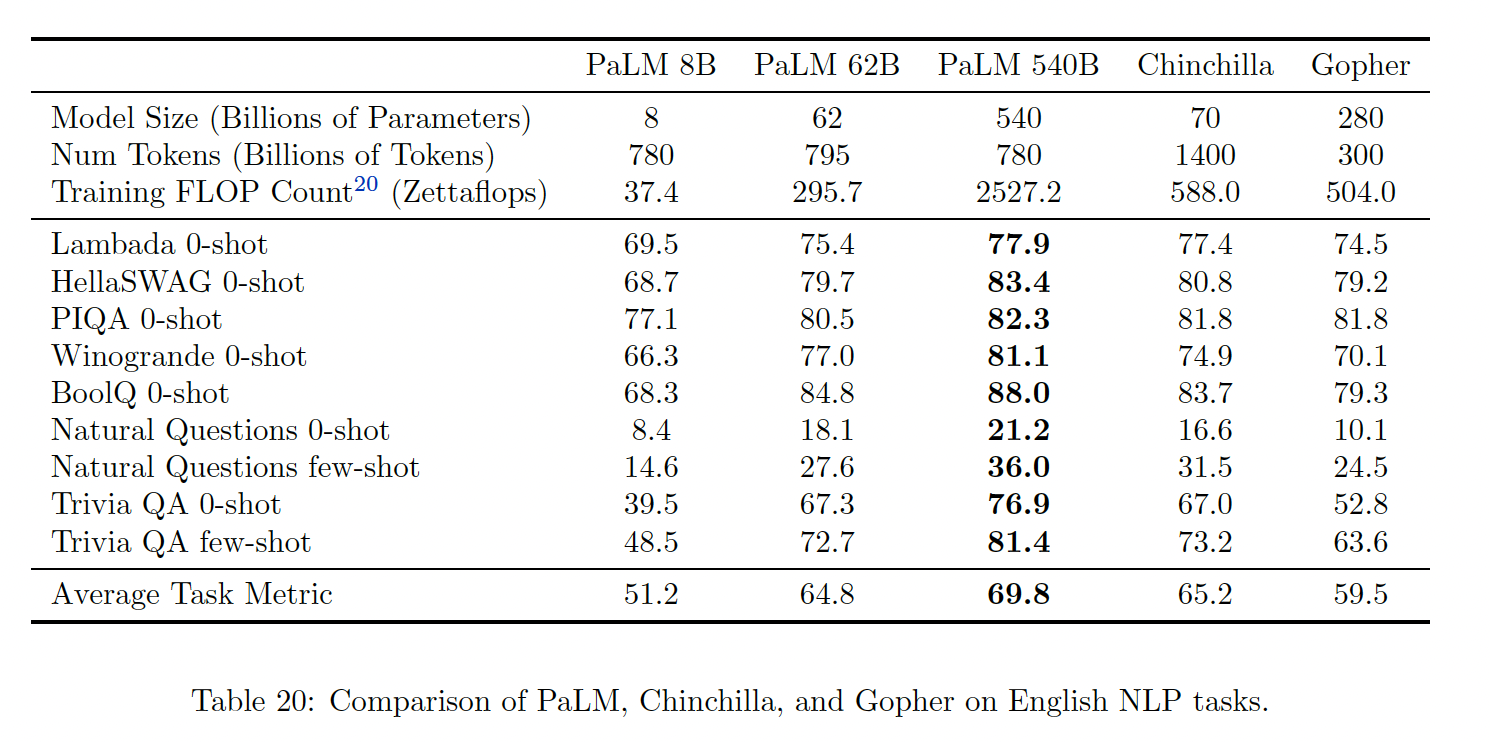 虽然模型的大小对取得这些结果起到了重要的作用,但 PaLM 540B 在所有基准上都超过了类似大小的模型(Megatron-Turing NLG 530B)。这表明预训练数据集、训练策略、以及 training tokens 数量也对取得这些结果起到了重要作用。