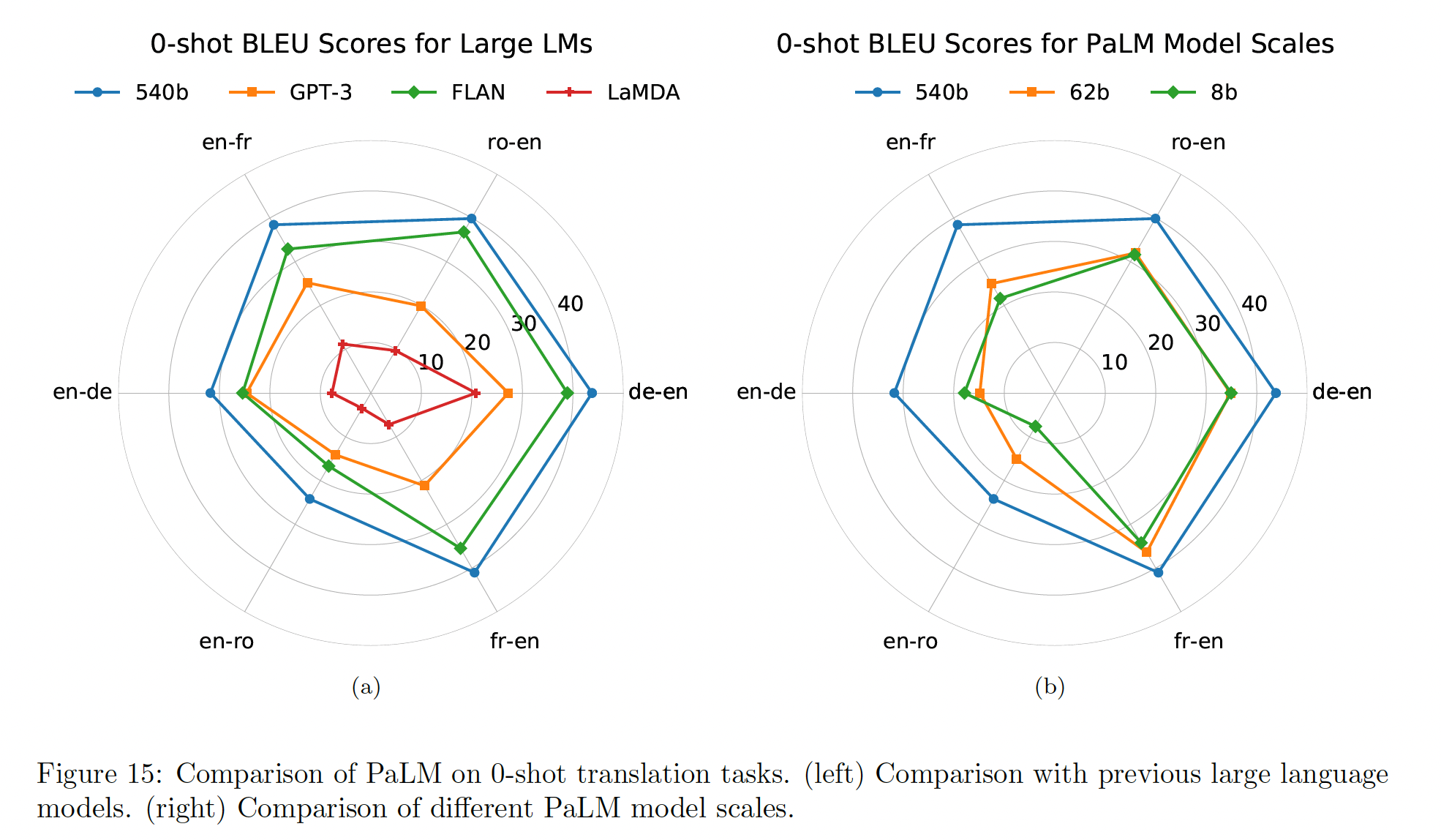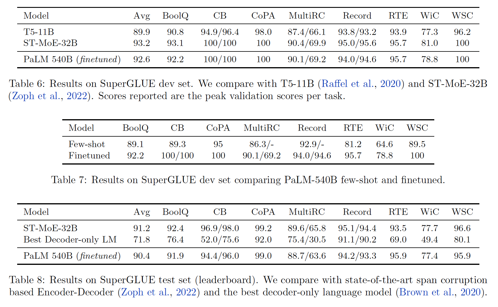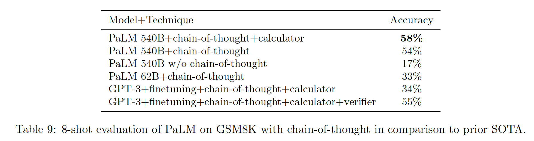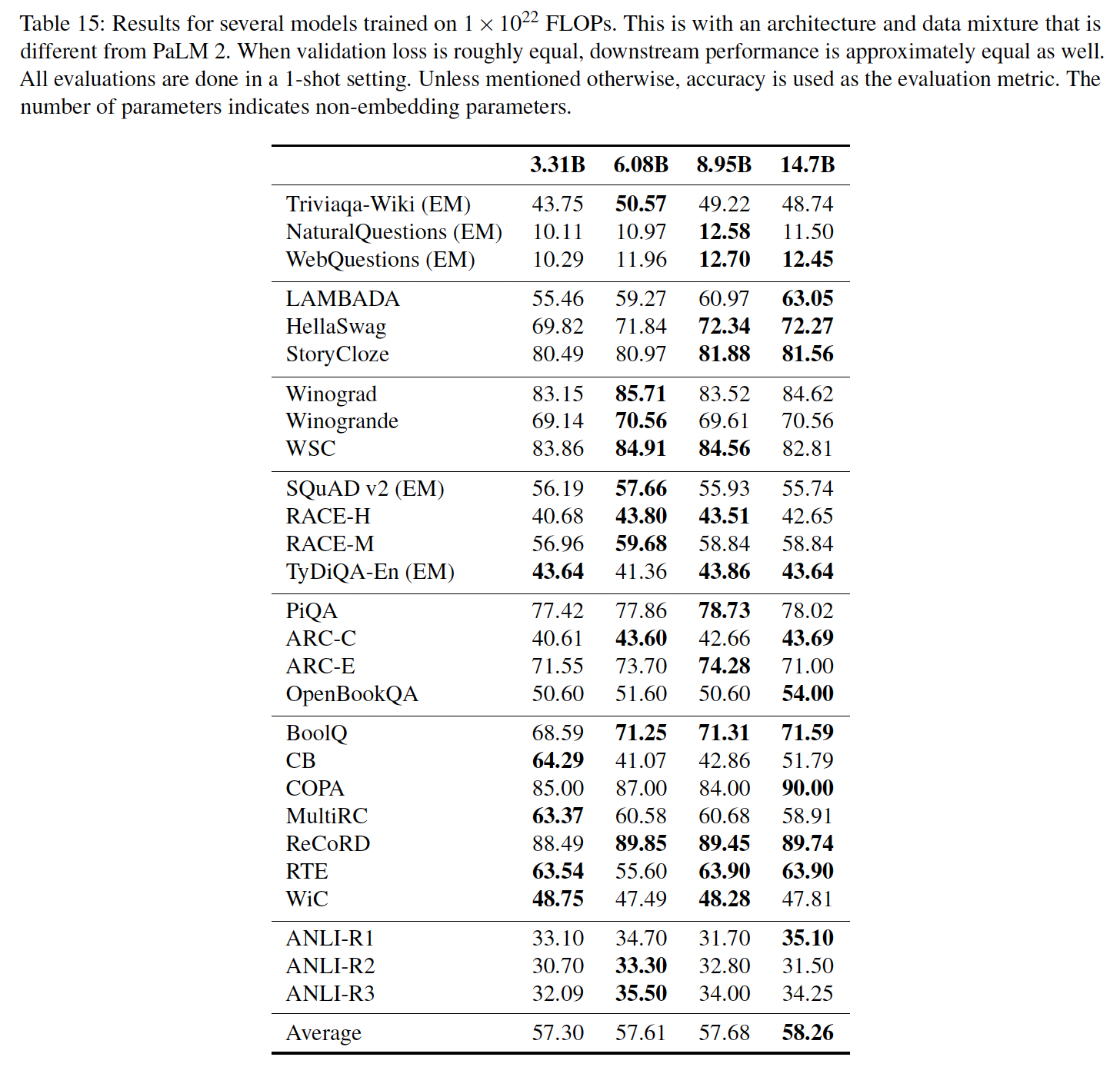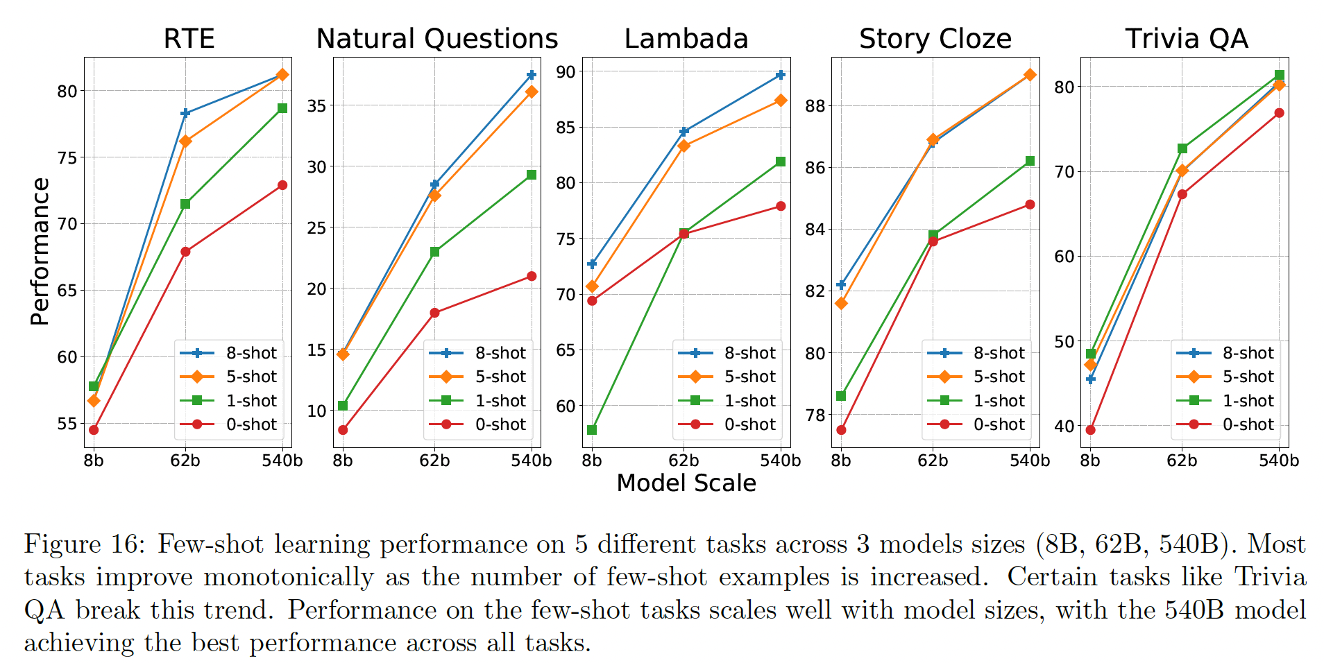 虽然模型的大小对取得这些结果起到了重要的作用,但 PaLM 540B 在所有基准上都超过了类似大小的模型(Megatron-Turing NLG 530B)。这表明预训练数据集、训练策略、以及 training tokens 数量也对取得这些结果起到了重要作用。