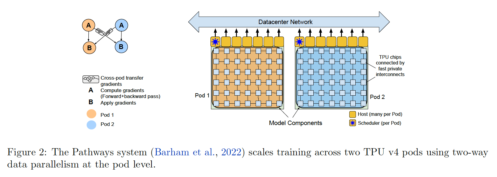 每个 TPU v4 Pod 包含一个完整的模型参数副本,每个权重张量使用 12 路模型并行、以及 256 路完全分片的数据并行在 3072 个芯片上被 partitioned ( 《Gspmd: general and scalable parallelization for ml computation graphs》 称之为 "2D finalized" 方法)。