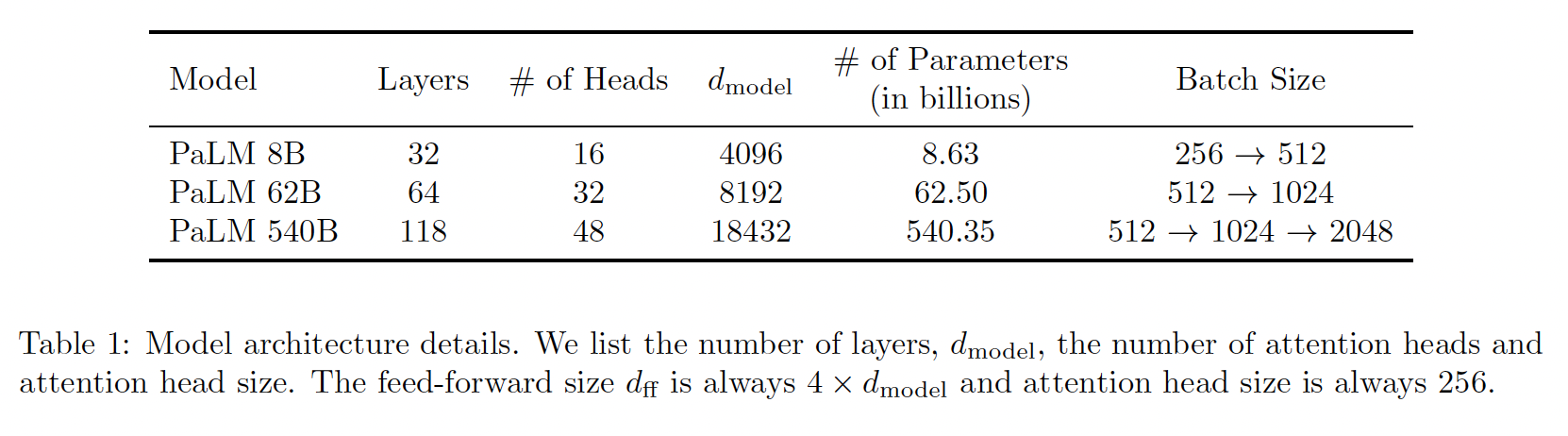 model scale 的超参数:在这项工作中,我们比较了三种不同的模型规模:540B 参数、62B 参数、8B 参数。FLOPs per token 数量大约等于参数的数量,因为这些模型是标准的 dense Transformer 。这些模型是用下表中的超参数构建的。这三个模型使用相同的数据和词表进行了相同的训练(除了 batch size )。