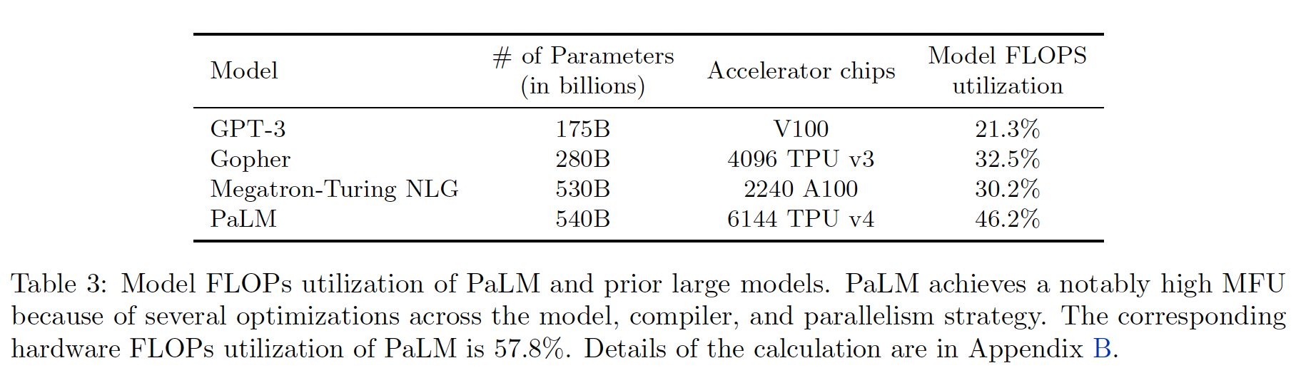 我们在下表中介绍了 PaLM 540B 的 MFU 。