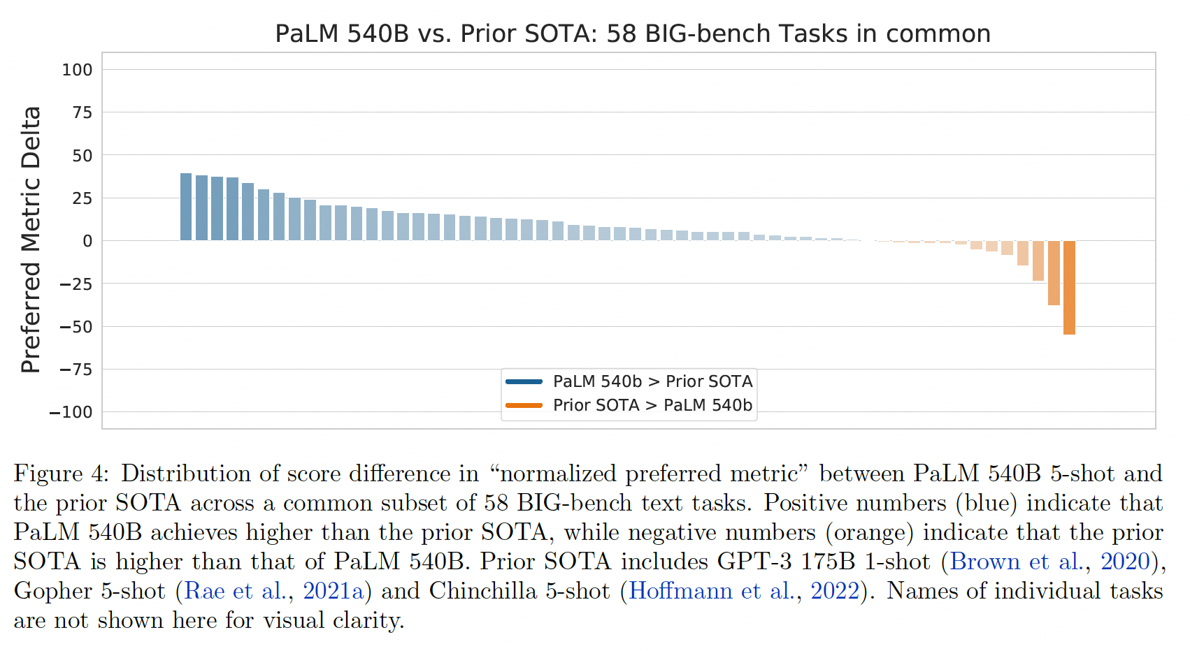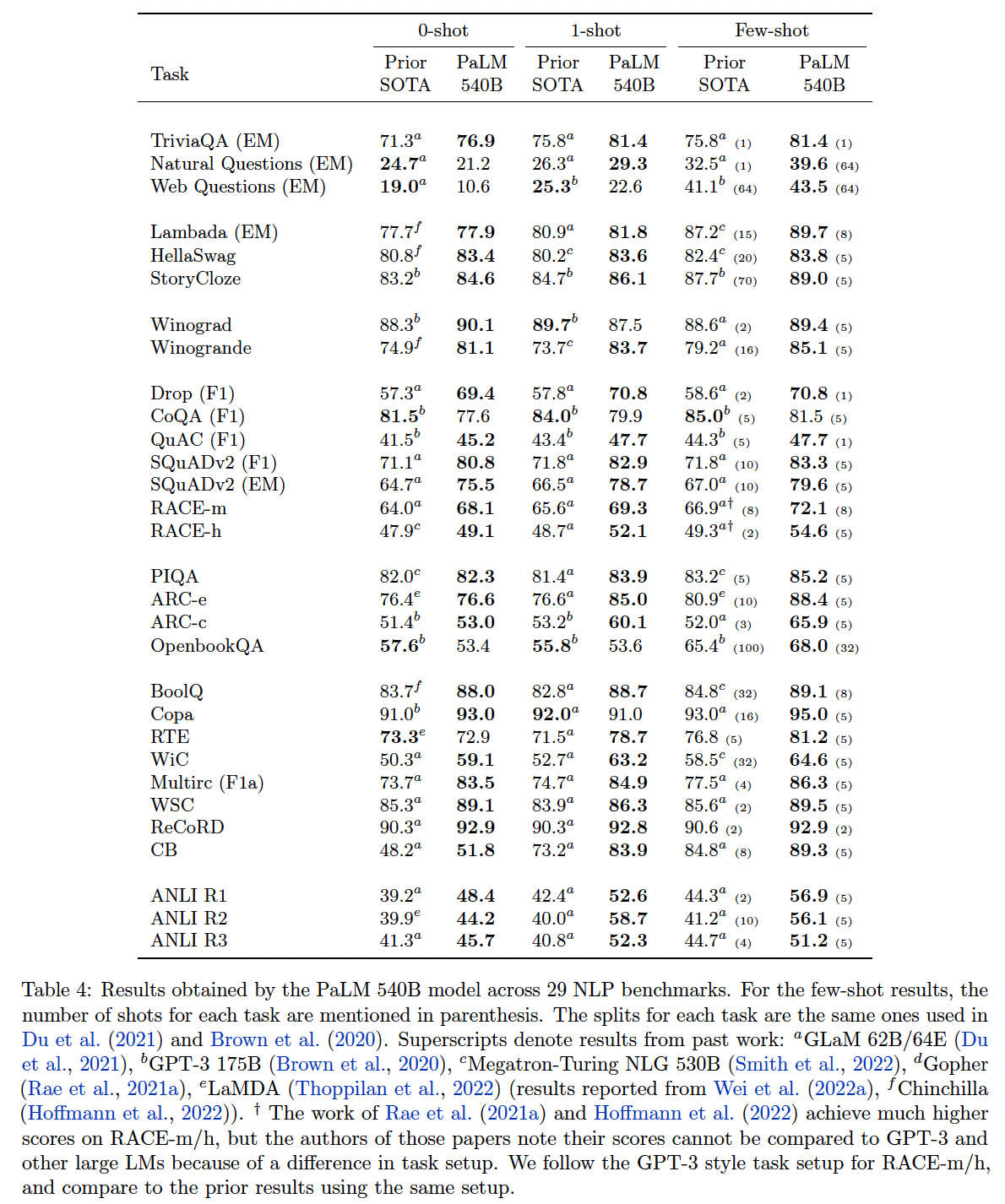 PaLM 540B 在 1-shot setting 的 29 项任务中的 24 项,以及在 few-shot setting 的 29 项任务中的 28 项,都优于之前的 SOTA 。