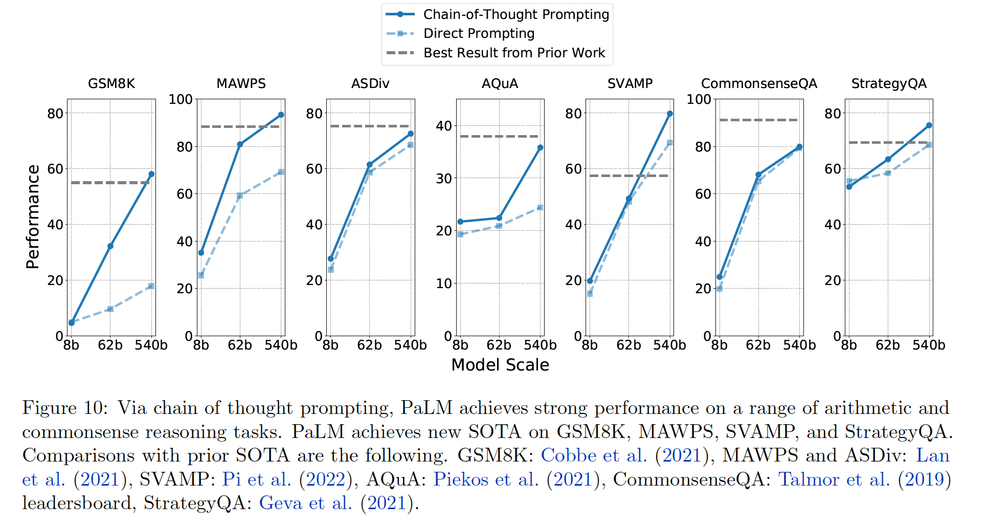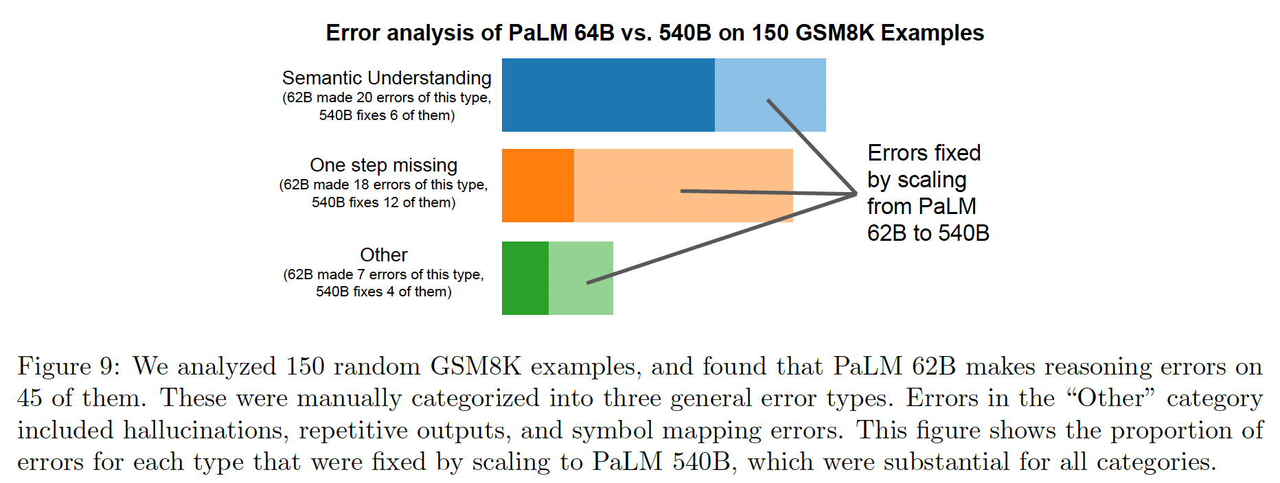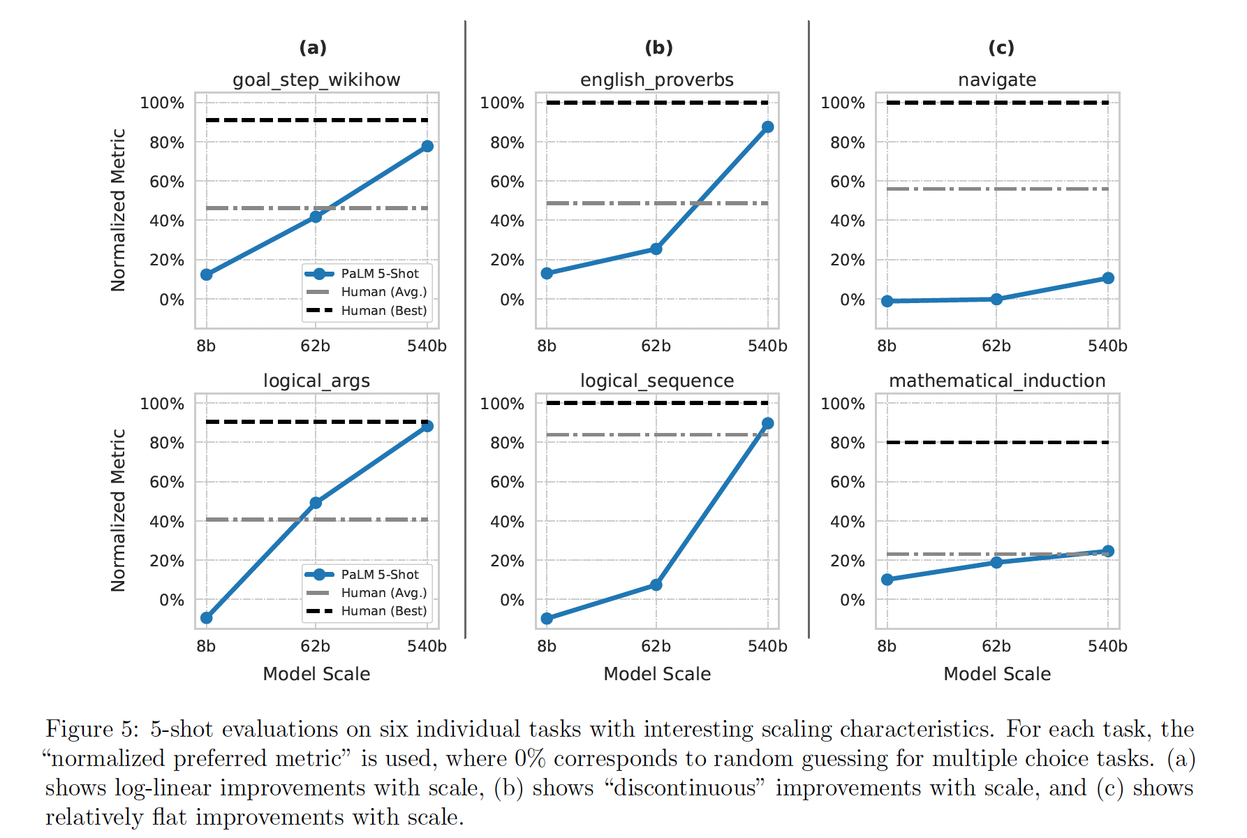 不连续的提升:为了更好地理解 scaling 行为,作者提出了三种不同参数规模的结果:8B/62B/540B 。通常情况下,从 62B 扩展到 540B 的结果与从 8B 扩展到 62B 的结果相似,这与神经网络扩展中经常观察到的 "power law" 规则一致。然而,对于某些任务,作者观察到不连续的改进,与从8B 到 62B 的 scaling 相比,从 62B 到 540B 的 scaling 导致了准确率的急剧上升。这表明,当模型达到足够大的规模时,大型语言模型的新能力就会涌现。