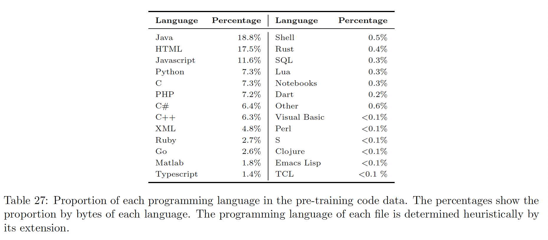 代码数据是从 GitHub 上的开源 repositories 中获得。我们通过 license 来过滤文件。此外我们根据文件名过滤文件,从而限制在 24 种常见的编程语言之一,包括 Java, HTML, Javascript, Python, PHP, C#, XML, C++, C 。最终得到 196 GB 的源代码数据。此外,我们根据文件之间的 Levenshtein 距离去除重复的文件,因为已知重复的文件在源代码库中很常见。