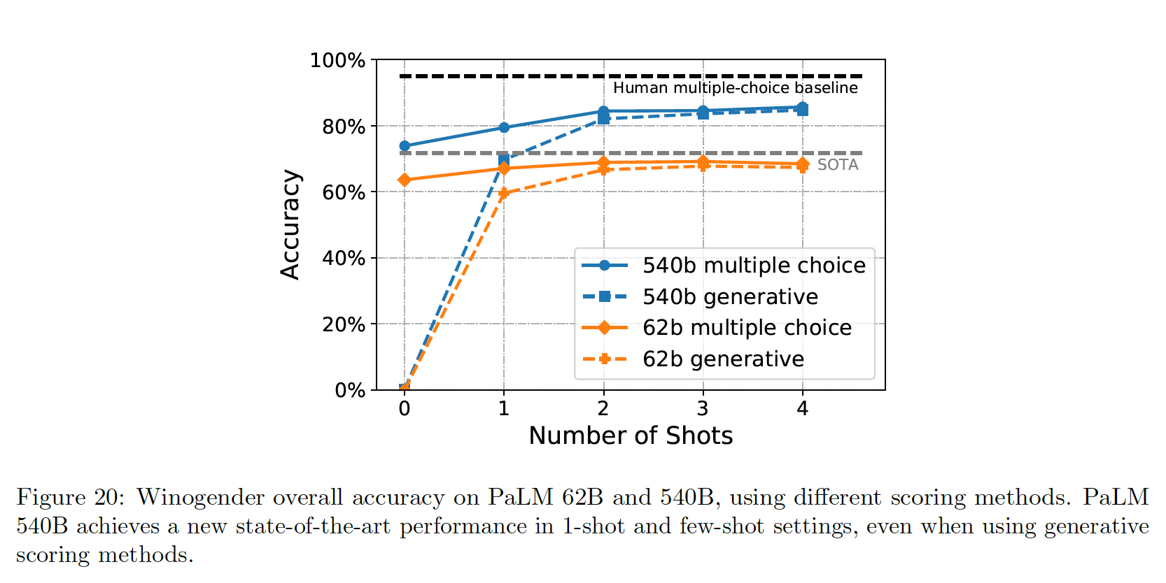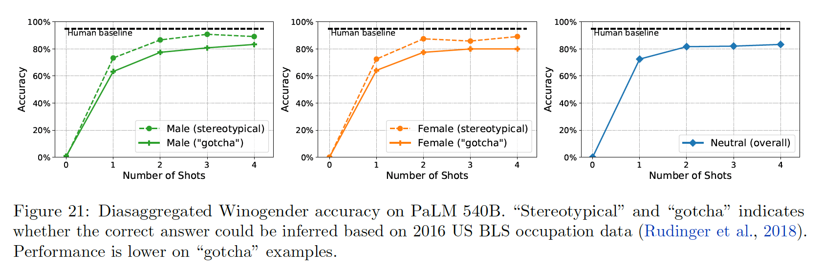 首先,对于性别和职业偏见,作者发现 Winogender 共指任务的准确率随着模型规模的扩大而提高,PaLM 540B 在 1-shot/few-shot setting 中创造了新的 SOTA 结果。