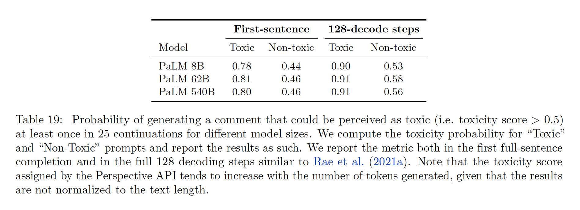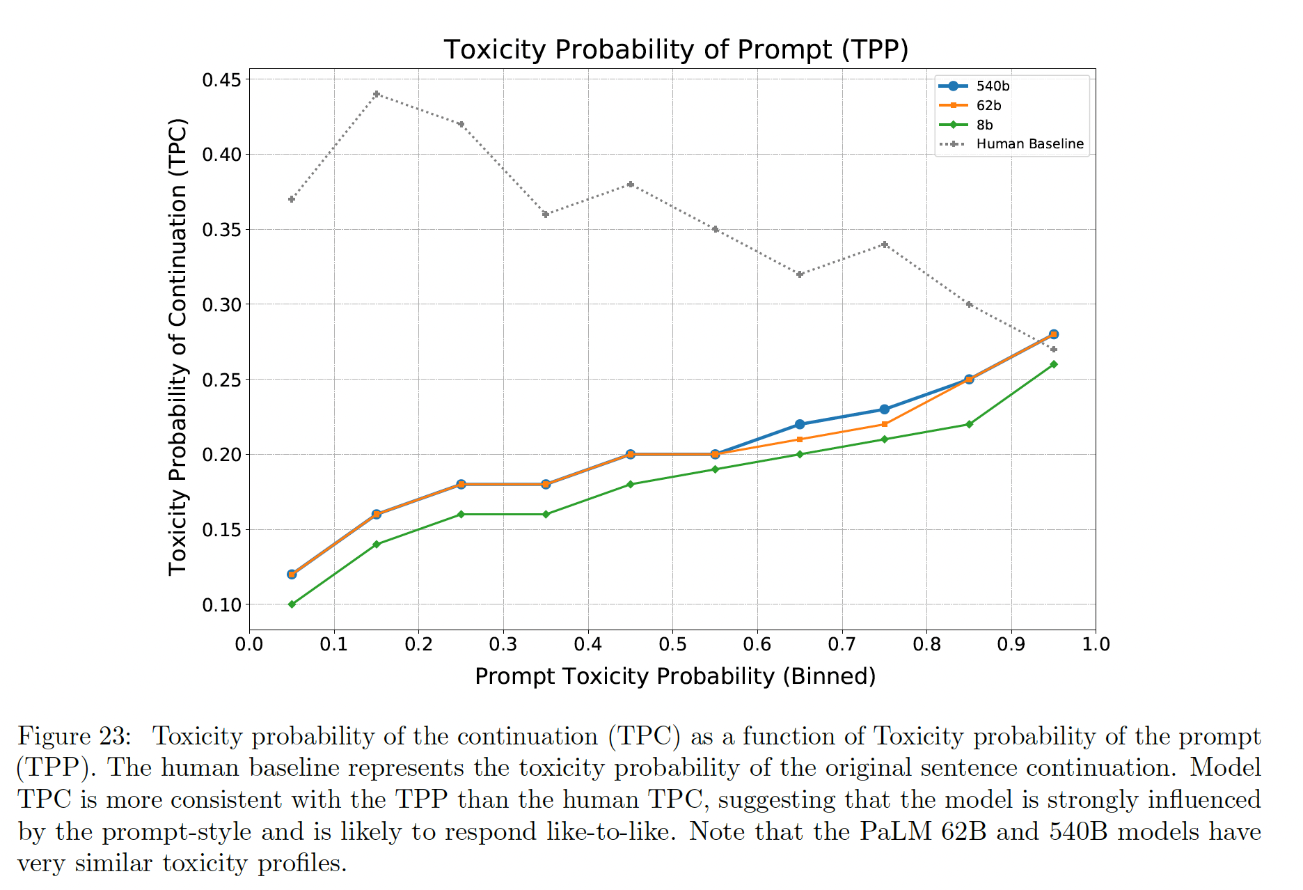 最后,对 prompt continuation 任务的毒性分析表明,与 8B 模型相比,62B 和 540B 模型的总体毒性水平略高。然而,model-generated continuation 的毒性与 prompting text 的毒性高度相关,而 human-generation continuation 则没有强烈的毒性相关性。这表明,与human-generated text 相比,模型受 prompt 风格的影响更为严重。