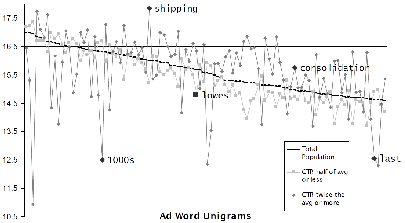 不同竞价词的平均点击率存在明显的差异,因此在预测某个广告的点击率时,相同竞价词的其它类似广告可能有所帮助。