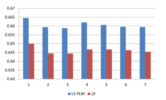 和 LR 的对比:LS-PLM 和 LR 模型在7个数据集上的对比如下图所示(评估指标为测试 auc )。