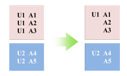 除了通用并行实现之外,我们还优化了在线广告环境中的实现。CTR 预估任务中的训练样本通常具有非常相似的共同特征common feature模式。如下图所示:用户 U1 在一个 session 中看到三条广告,因此产生三个样本。事实上,这三个样本共享 U1 的画像特征(如:年龄、性别、城市、兴趣爱好等)。