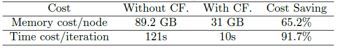 worker 中。由于阿里巴巴的生产数据具有共享特征的模式,因此该技巧可以大幅度提高训练速度。在 100 个 worker 、每个 worker 12个 CPU core、11GB 内存的条件下,实验结果表明:内存显著降低到 1/3,计算速度加快 12 倍左右。