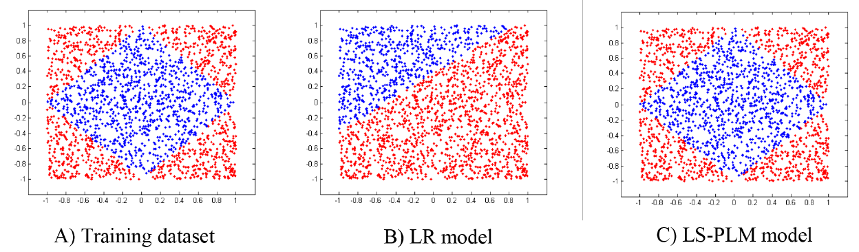 下图说明了在一个 demo 数据集中,该 LS-PLM 和 LR 模型的差异。图 A) 是 demo 数据集,这是一个二分类问题,红点属于正类、蓝点属于负类。图 B) 显示了使用 LR 模型的分类结果,图 C) 显示了使用LS-PLM 模型的分类结果。可以清晰地看到 LS-PLM 能够捕获到数据中的非线性模式。