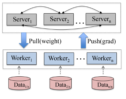 worker 节点。每个 worker 结点存储部分训练样本,以及一个局部模型。该局部模型仅仅保存用于训练本地样本的模型参数。server 节点。每个 server 结点分别独立的存储全局模型中的一部分。在每次迭代过程中:
