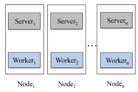CPU 的计算能力。在传统的 parameter server setting 中,server 节点作为分布式 KV 存储来使用,具有 push/pull 操作的接口,计算成本低。将 server 节点与 worker 节点一起运行可以充分利用算力。128 GB。通过运行在同一个计算节点上,server 节点和 worker 节点可以更好地共享和利用大内存。