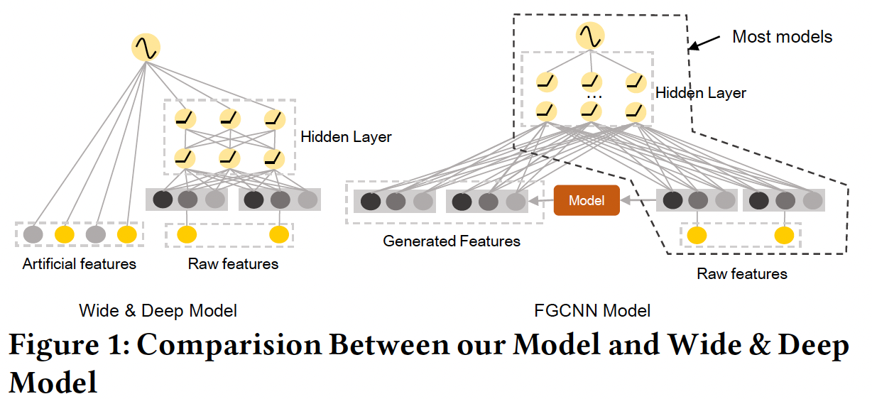 因此,如下图所示,论文 《Feature Generation by Convolutional Neural Network for Click-Through Rate Prediction》 提出了一个自动生成特征的通用框架。原始特征被馈入到机器学习模型(右图中的红框),从而识别和生成新的特征。之后,原始特征和新特征被结合起来,并馈入一个深度神经网络。被生成的特征能够通过提前捕获稀疏的但重要的特征交互来降低深度模型的学习难度。