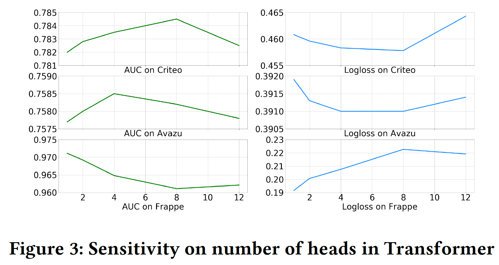 我们强调,对于 Avazu_x4 ,我们设置了一个小的 min_count 阈值,因为它确实导致了比 AutoInt 中的原始设置(min_count=10 )更好的性能。然而,我们注意到,在我们的 benchmark 中,不同模型之间的相对比较是公平的,因为所有的模型都处于相同的 embedding size 。我们的 benchmark 力求在进行模型比较时提高 baseline 的水平。