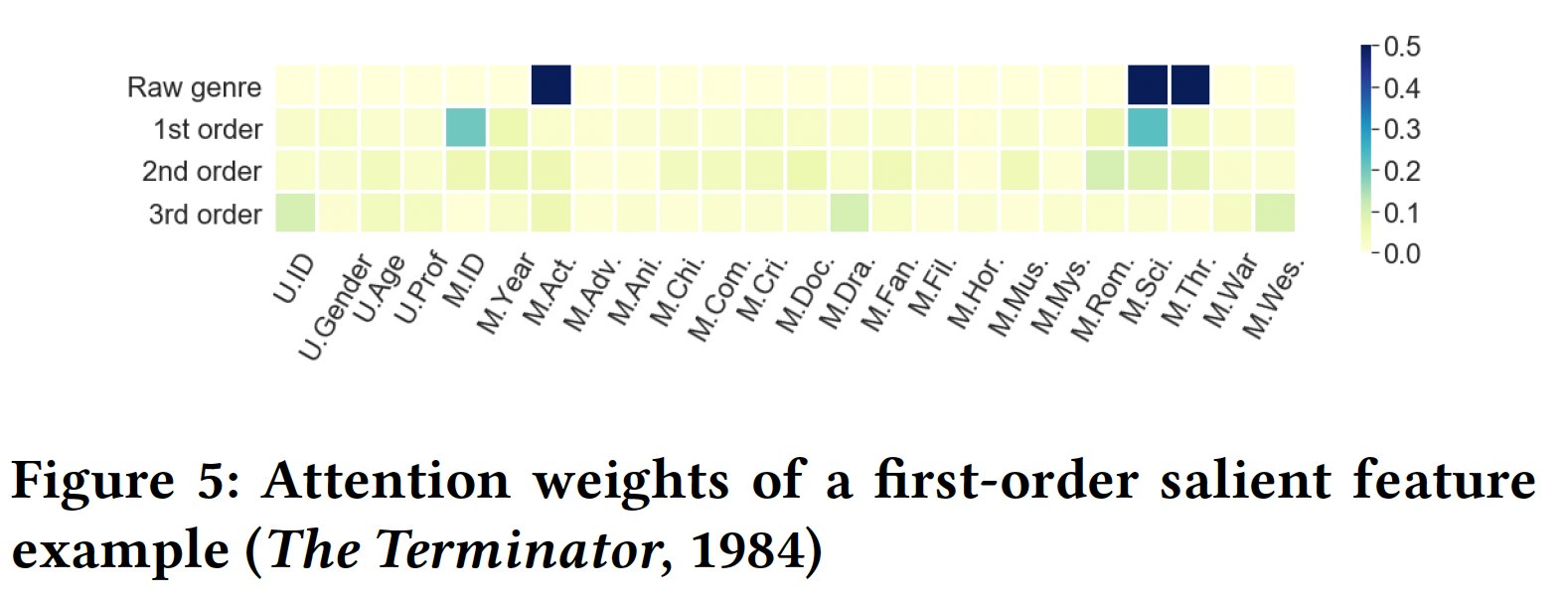 此外,通过 sum 三个神经元的特征阶次,发现最 discriminative 的 feature field 是 item id, is free, user id 。这是合理的,因为 user id 和 item id 是协同过滤中最常用的特征;而 is free 表示用户是否为 mobile app 付费,是用户对 app 偏好的一个有力指标。