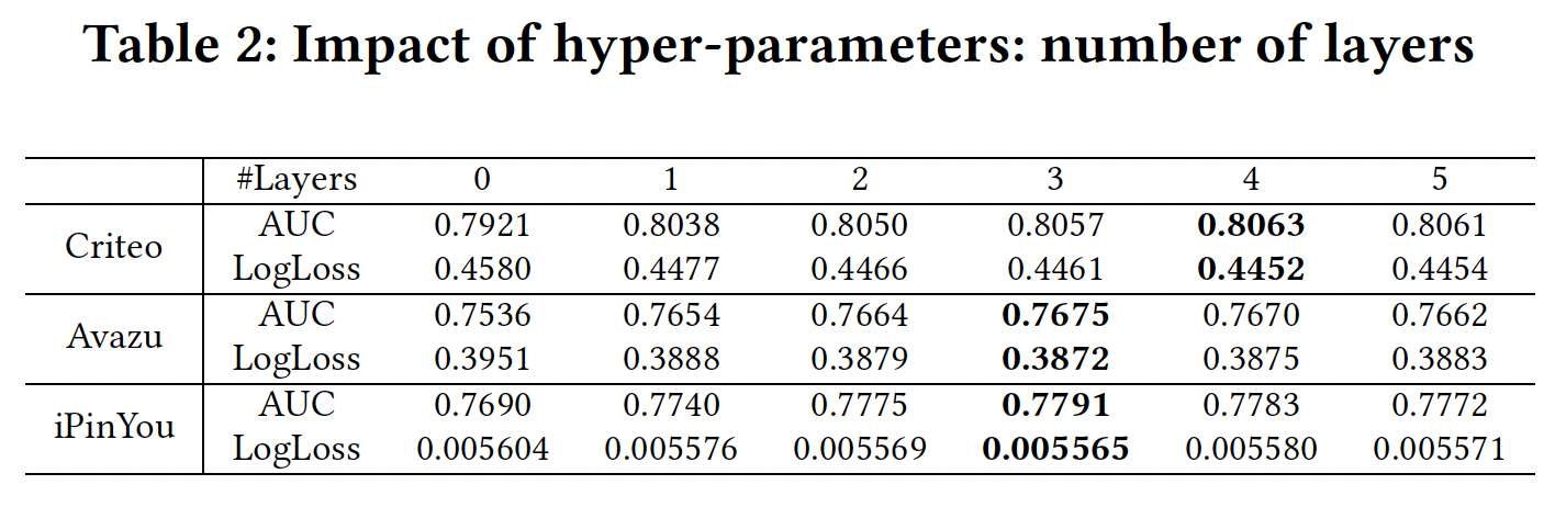 AFN 的性能呈现上升趋势,随后是下降趋势。这表明应该采用适当数量的对数神经元,在表达能力和泛化之间做出权衡,以达到最佳性能。5 个,AFN的优势也很稳定。这一结果表明,找到少量的 discriminative 交叉特征对预测的准确性至关重要,而 AFN 对于找到这些关键的交叉特征是有效的。隐层深度:如下图 (b) 所示: