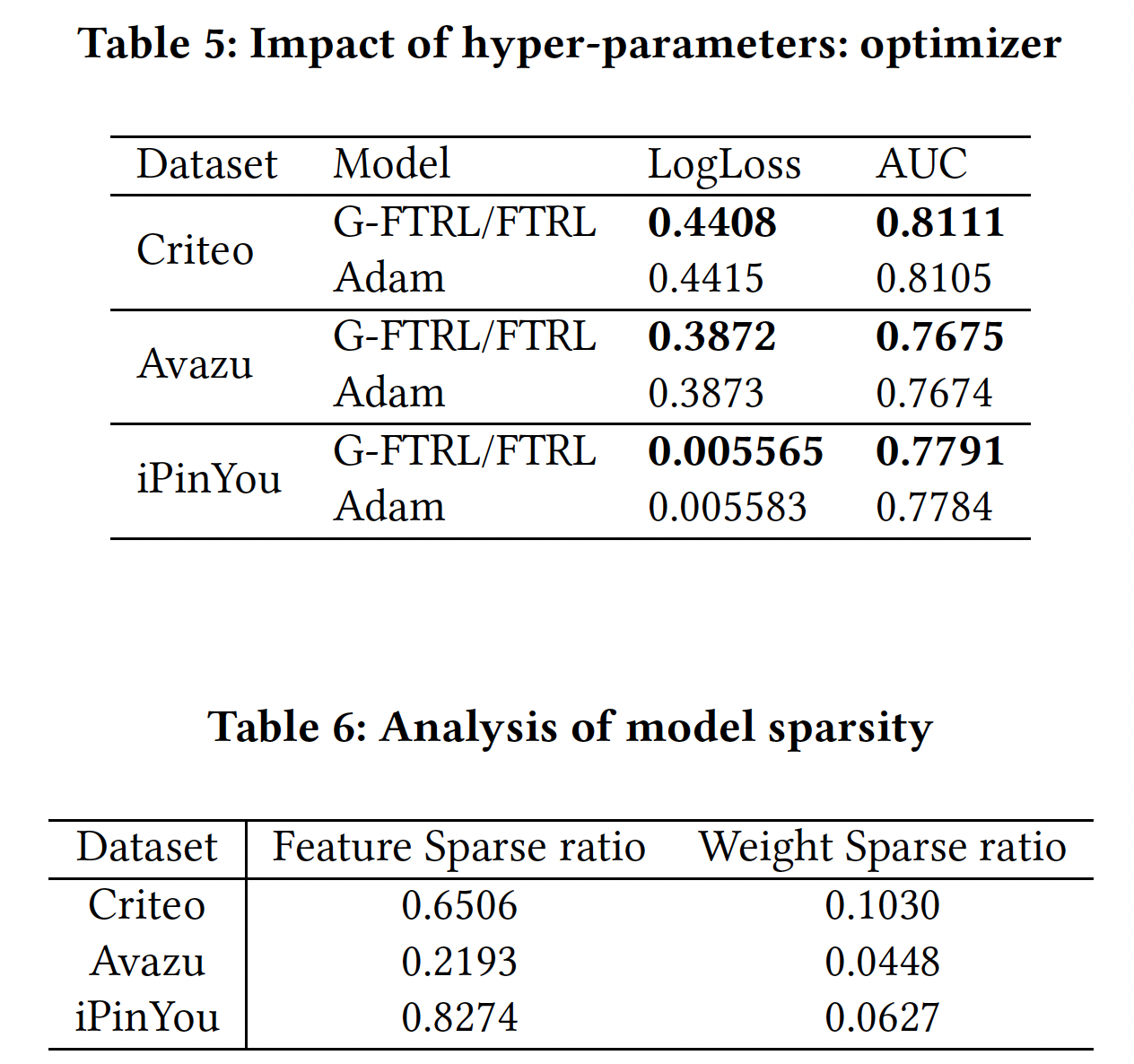 关于优化器,对于神经网络模型我们采用学习率为 0.001 的 Adam 优化器,对于 LR 和 FM我们采用学习率为 0.01 的 FTRL。