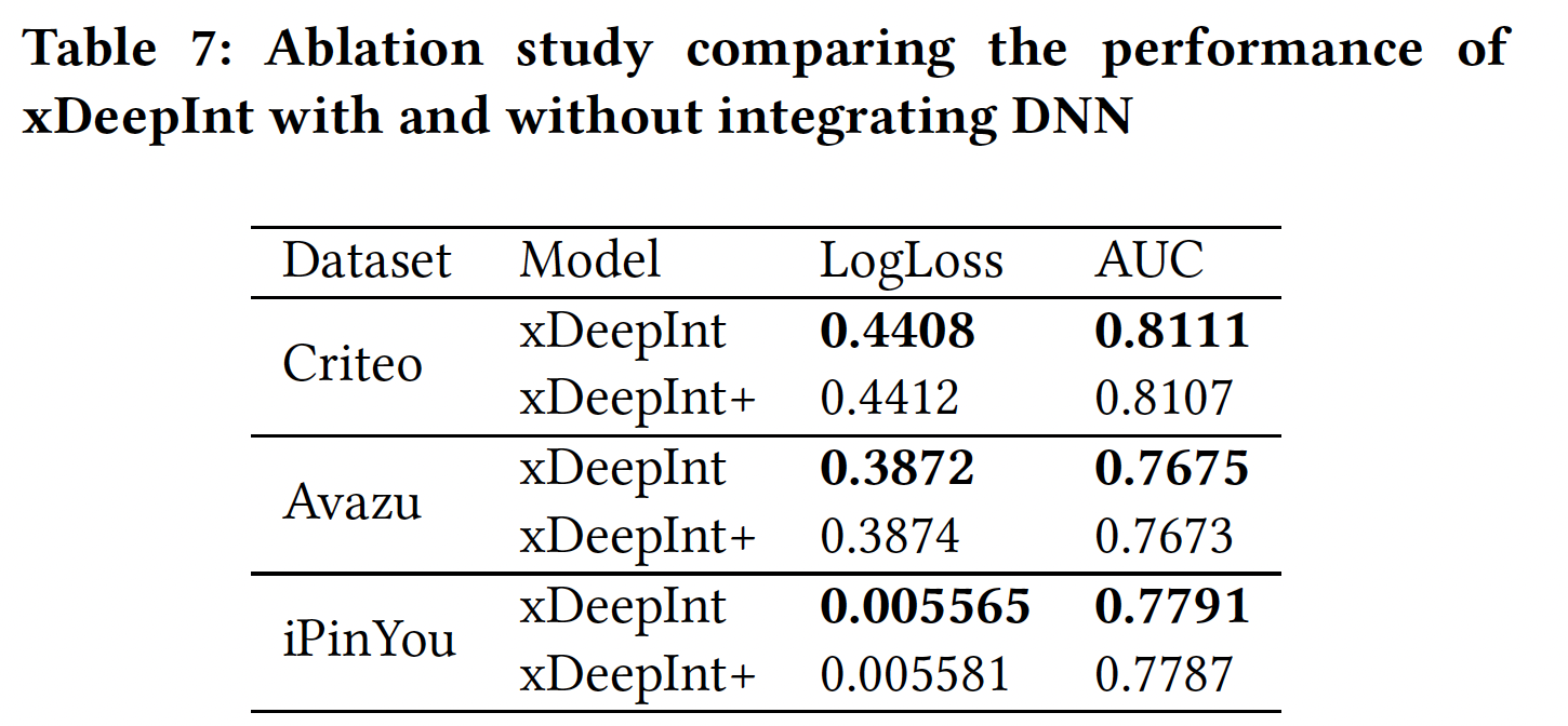 集成隐式交互:这里我们进行了消融研究,比较了我们提出的模型在集成隐式特征交互、以及不集成隐式特征交互的情况下的性能。在本实验中,我们将 xDeepInt 与三层前馈神经网络联合训练,并将组合模型命名为 xDeepInt+ ,与普通 xDeepInt 进行比较。
