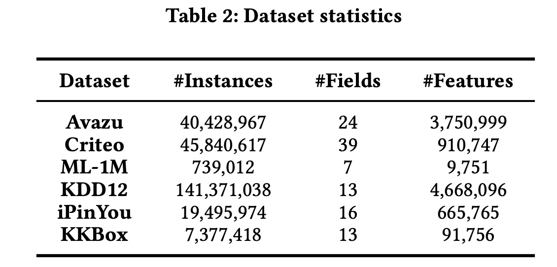数据集:两个流行的benchmarks (即Avazu、Criteo )和一个工业数据集。Table 1 总结了所有三个数据集的统计数据。