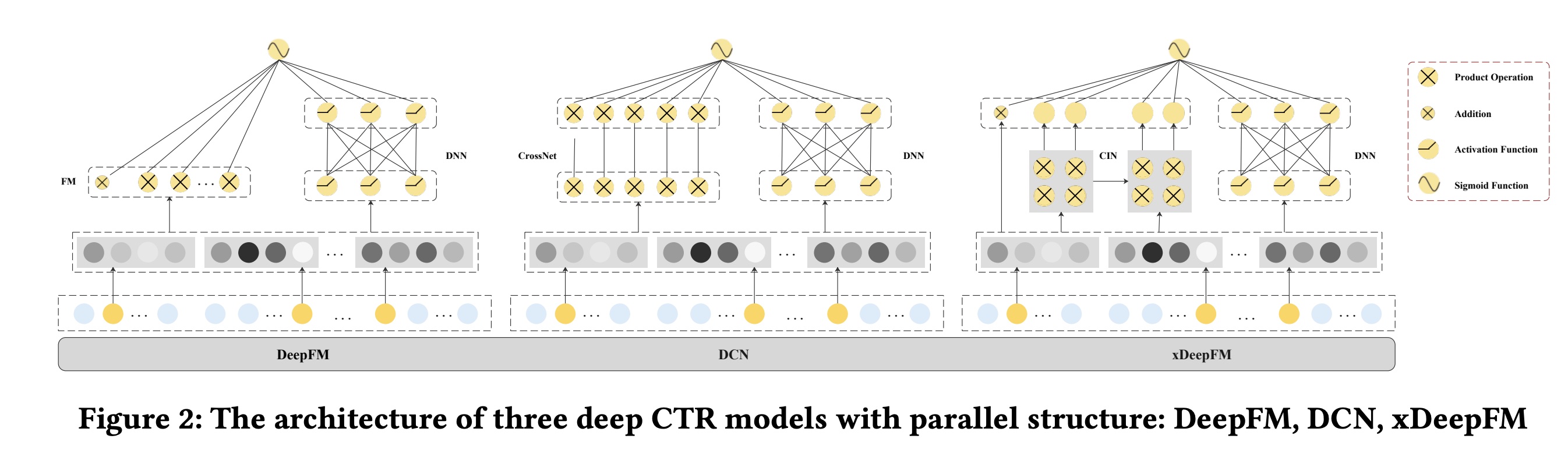另一方面,具有并行结构的模型以并行的方式联合训练两个网络,例如DeepFM 、DCN 和xDeepFM ,如Figure 2 所示。