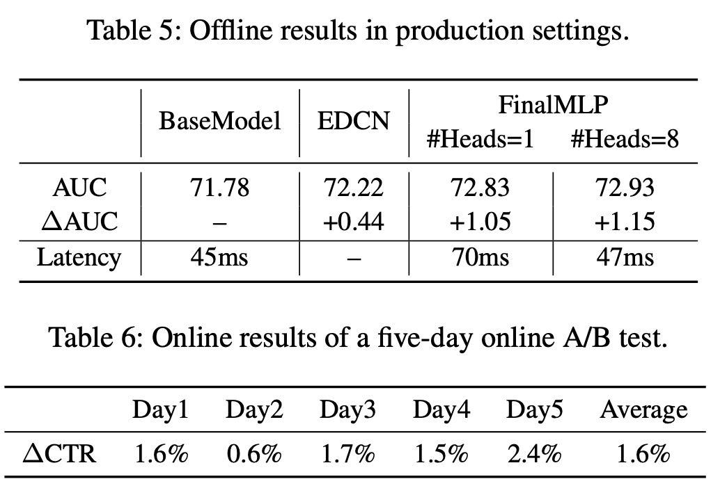 Industrial Evaluation:我们进一步在新闻推荐生产系统中评估FinalMLP ,该系统每天为数百万用户提供服务。我们首先使用来自3天的用户点击日志(包含1.2B 个样本)的训练数据进行离线评估。AUC 结果如Table 5 所示。