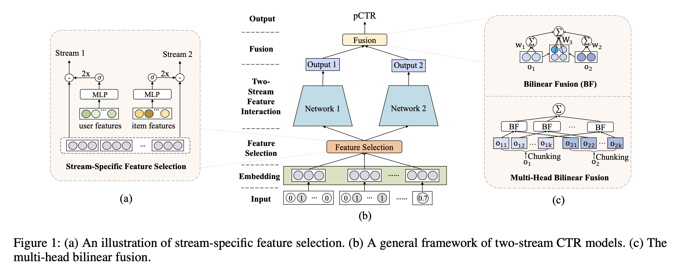layer ),通过用stream-level feature interaction 来融合stream outputs 。如Figure 1(c) 所示,所预测的点击率公式如下: