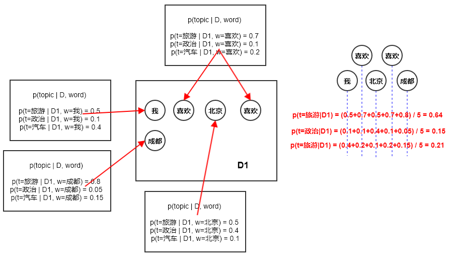 则已知文档 中出现了单词 的条件下,该单词由主题 生成的概率为: